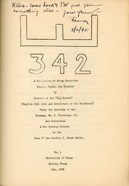 First edition. Quarto. Inked inscription on the title page: "Niles - come back & I'll give you something else -- your friend - Frank 8/2/40." On the front cover is the inked name of R. Niles Graham. Decorated wrappers, [8], 67 [4] pp., mimeographed sheets, printed one-side only, illustrated. Introduction by J. Frank Dobie. Stories by students of Dobie's class at the University of Texas, titled "Life And Literature of the Southwest." The University's designation for the course is E [English] 342. Contributions include the work of Faye Davidson, Estelle Rogers, Elithe Hamilton Beal, Paul Rosenfield, and others. Rare anthology of student writings from Dobie's English Lit class E-342 Fine copy.