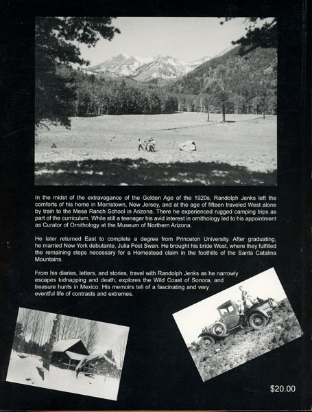 First edition. 4to. in pictorial wrappers. 170 pp. Numerous photographs. Illustrations. Dedication. Acknowledgements. Contents. Preface. Addendum. Signed by the author. The diaries, letters and stories of Randolph Jenks who left his home in Morristown, New Jersey in the 1920's when he was only 15 and traveled by train to the Mesa Ranch School in Arizona. Chapters include Early Boyhood at Mount Kemble; Mesa Ranch School; Discovery of Deerwater; Homesteading Esperero, Alamos; In Search of the "Lost Dutchman Mine;" The Adventure of Geronimo's Lost Treasure; Dig for the Saric Treasure; Pimas; Ornithology and Life Zones; etc. Fine.