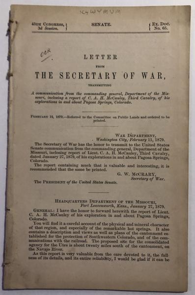 First Edition. Disbound. 27pp. 45th Congress, 3rd Session. Senate. Ex. Doc. No.65. Folding Map: Topographical Sketch of Pagosa Springs, Colorado, Showing Location of Camp Lewis, The New Cantonment, Hot and Cold Springs, &c, &c. A very interesting and detailed report of the Pagosa Springs area...it's history and attributes as a military station. Fine copy.
