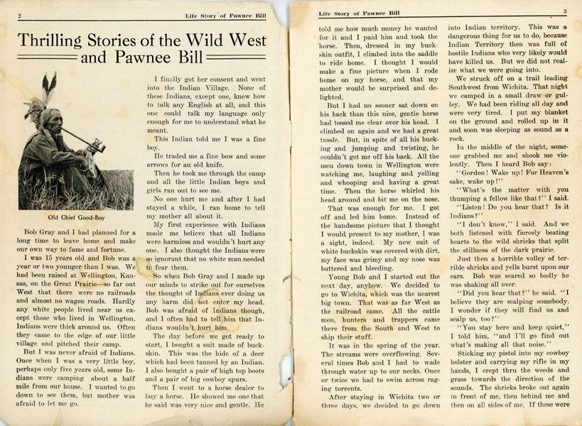 First edition. 8vo. Pictorial wrappers, 32 pp. [including covers], double column, illustrated, advertisements. The life story of Gordon W. Lillie, also known as "Pawnee Bill," including his adventures with Indians, outlaws, buffalo hunts, bronco busting, etc. Six Guns 1334 says, "Contains some material on Jesse James." Light wear to spine ends, tiny chip to bottom edge of rear cover, front cover and page 21 lightly soiled, else a very good copy.