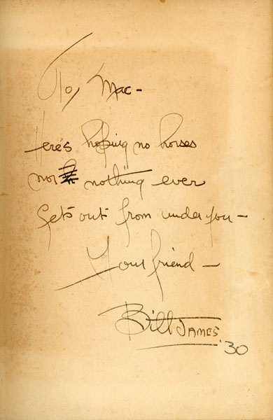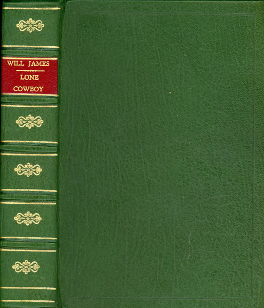 First edition. 8vo. Inscribed in the year of publication on the front free fly leaf : "To Mac - / Here's hoping no horses / nor nothing ever / gets out from under you - / Your friend - / Bill James '30." Don Frazier says : "Will often signed himself as Bill or Bill James to his wife and close friends." Original green cloth has been replaced with green leather, raised bands on the spine, gilt spine decorations and titles stamped in gilt on a red leather spine panel, x [2], 431 [2] pp., frontispiece is a photograph of the author, and numerous illustrations by him. Words "Published August, 1930" and code letter "A" on copyright page. A bit of toning to the front endpapers else a fine, bright, square copy lacking the original dust jacket. A nice collector's copy of this popular author's autobiography. and apparently much appreciated by the original owner.