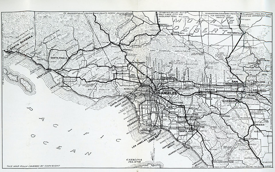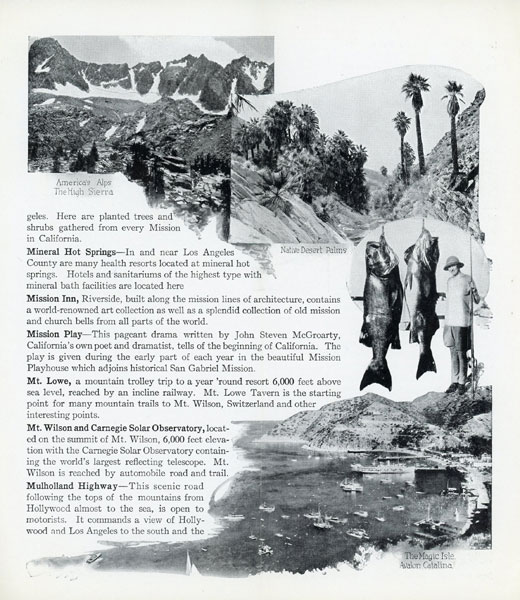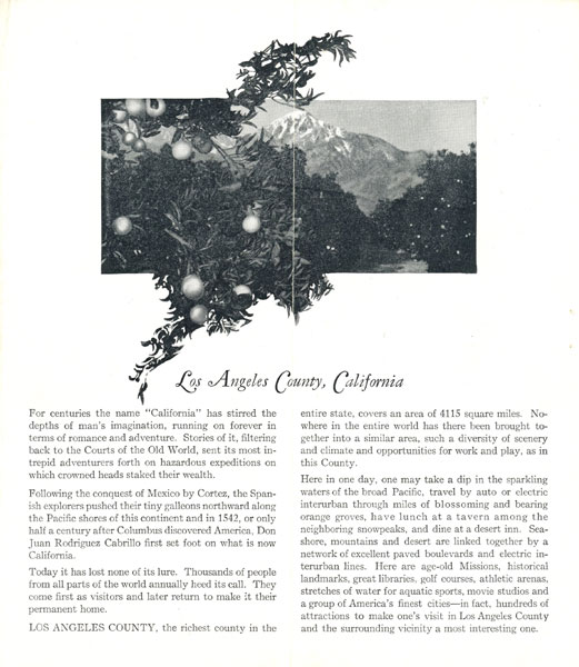 9" x 8" color, pictorial wrappers, folds to 9" x 4," n. p. [18 pp. or 36 panels], illustrated from photographs, road map of Southern California at the center. Color cover art work by Arthur Beaumont (1890-1978) a Los Angeles-based watercolor artist and commercial artist best known for his maritime scenes. Includes short descriptions of major attractions Los Angeles, suggestions for excursions to the San Fernando Valley, San Gabriel Valley. Antelope Valley, Orange County, Pasadena, Long Beach, Beach Cities, Riverside, Palm Springs, Imperial Valley, San Diego, etc., and some information on lodging and transportation. Tiny staple holes at the outer margins, covers lightly rubbed, else a very good copy.
