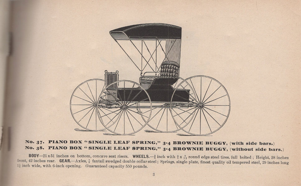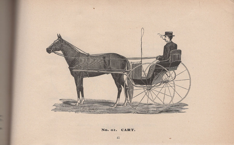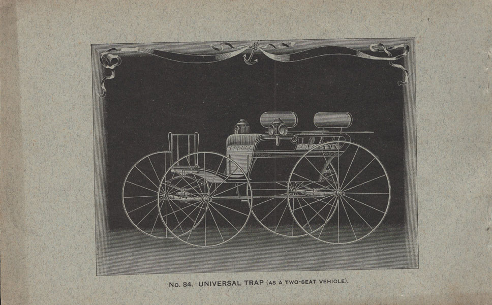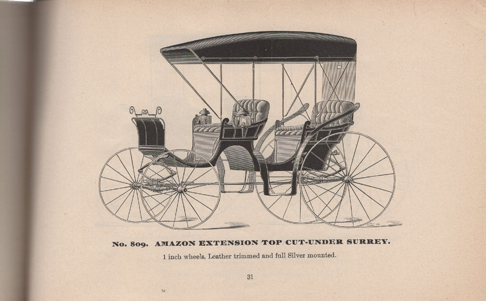 5 7/16" x 8 5/8" oblong printed stapled wrappers, 52 pp., illustrated. A lovely trade catalogue for this Kentucky-based carriage manufacturer. Each page carries an illustration of a different carriage, a few of which show amusing little elves working on the carriages. Most give specifications on the carriages, including wheel and body size, leg room, etc. This M. Michael & Bro. catalogue is not listed on OCLC, which only lists an 1895 catalogue for the firm (three copies located); nor is it listed in Romaine. A small chip to the fore-edge of the front cover else a near fine copy. Scarce and quite nice.
