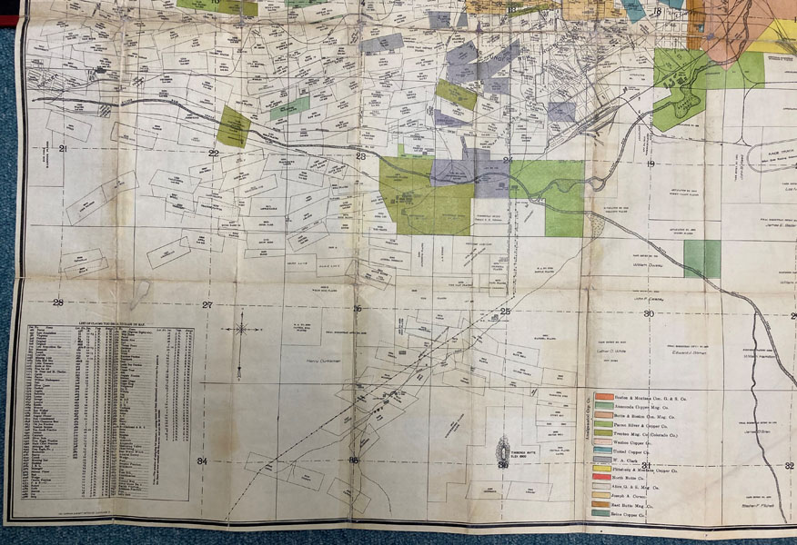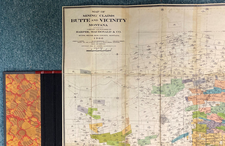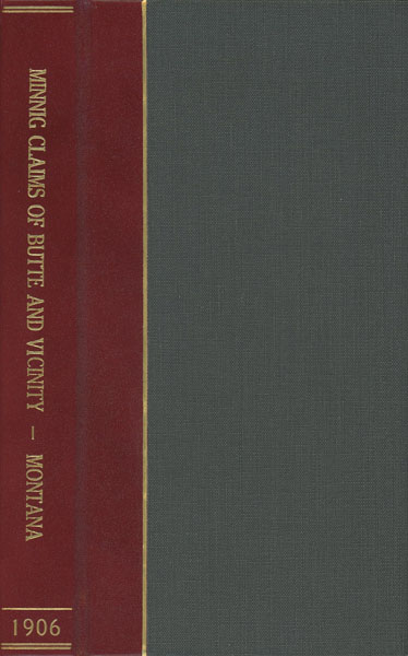 29" x 36" color map that folds to 3 1/2" x 7 1/2" and housed in a quarter leather and cloth binding. Over 100 silver and copper claims are identified on the map with 14 of the larger ones individually color coded. Also a 5" x 4 3/4" listing of Claims too small to name on the Map. The map is in very good condition and has been rebacked by a master paper conservator and housed in a quarter leather and cloth binding with titles stamped in gilt on the spine.