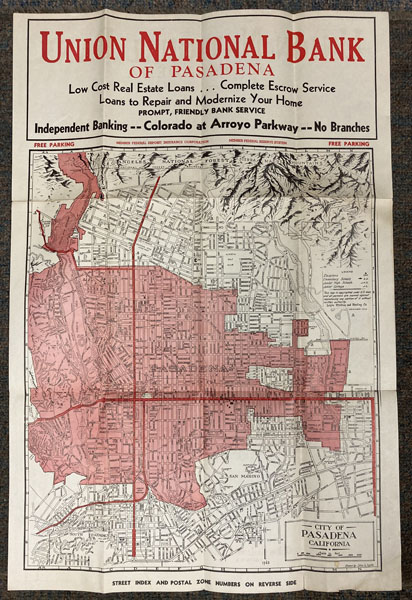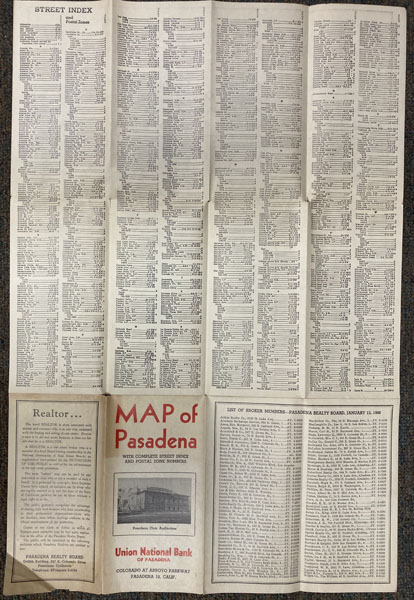 24" x 16" sheet folded to 24 panels. One cover panel; 1 panel offer information about realtors; 8 panels offer street index and postal zones; 2 panels offer a list of broker members of the Pasadena Realty Board. Opposite 12 panels offer street map of Pasadena, printed in red and black. Map is dated November, 1943.Tanning to a couple panels as well as small splits to 4 folds and with a crease to bottom corner of a panel. Still very good.
