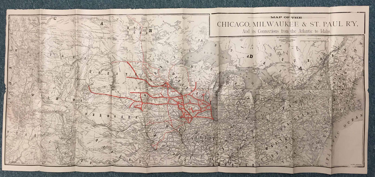 16" x 37" sheet folded to 40 panels each 8 1/8" x 3 5/8" with attractive wrapper art of Kilbourn City and the Dells of Wisconsin. 20-panel detailed map of much of the United States, their lines and connections in red from Chicago, Green Bay, Duluth, to Kansas City, Deadwood City, Bismarck and up into Manitoba. Backed with 20 panels of time tables and information on connections and list of advantages of riding the Chicago, Milwaukee and St. Paul Railway. Lightly worn at the extremities. Very good.