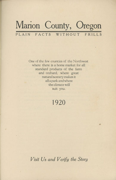 First edition. 9 1/8" x 6" in buff printed wrappers. 48 pp. Centerfold map of Marion County showing boundaries of the Reserves, the county boundary, wagon roads, railroads, and trails. Chart showing weather statistics. Home to Salem, the capital city of the State of Oregon, “Marion County lies principally in the open Willamette valley, although a narrow panhandle extends eastward to the Cascade Mountains… Its area is 1,194 square miles, almost identical in size with the state of Rhode Island… [In Oregon] The county is first in hop; first in prunes and loganberries; first in oats; second in population; second in potatoes; first in pears; first in raspberries; first in onion sets; third in walnuts; first in clover; second in cherries; fourth in quinces; second in peaches; first in strawberries and sixth in wheat.” Various authors contributed to sections on the virtues of Marion County and its agriculture, manufacturing, lumbering, climate, education, YMCA work, water power, land values, and paved roads. In addition, there are write-ups for the county’s cities and towns to include Aumsville, Aurora, Donald, Gervais, Hubbard, Jefferson, Marion, Mill City, Monitor, Mt. Angel, Salem, Scotts Mills, Sidney, Silverton, St. Paul, Stayton, Turner, West Stayton, and Woodburn. The booklet provides a quick overview of Marion County after the First World War as it attempts to attract homeseekers. Light soiling and foxing on the covers, otherwise very good.