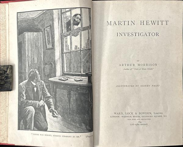 First edition. Illustrated by Sidney Paget. Spine a bit faded else a very good, solid copy. As Vincent Starrett once wrote: "After Holmes, the deluge!" Martin Hewitt is the only contemporary imitator of Sherlock Holmes to survive the years. Queen's Quorum 18 says "Imitators multiplied rabbidly, and if you look closely, you will see the same spawning process going on still. The Holmes pattern persists even today. Of Doyle's contemporary imitators the most durable (indeed the only important one to survive the years) is the private investigator, a man of awe-inspiring technical and statistical knowledge, in Arthur Morrison's MARTIN HEWITT, INVESTIGATOR." Seven well-written short stories that feature Martin Hewitt and his able assistant, Brett, a journalist. A Haycraft/Queen Cornerstone mystery and Queen's Quorum # 18.