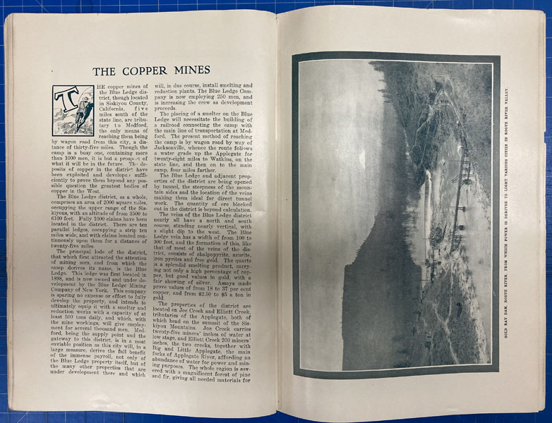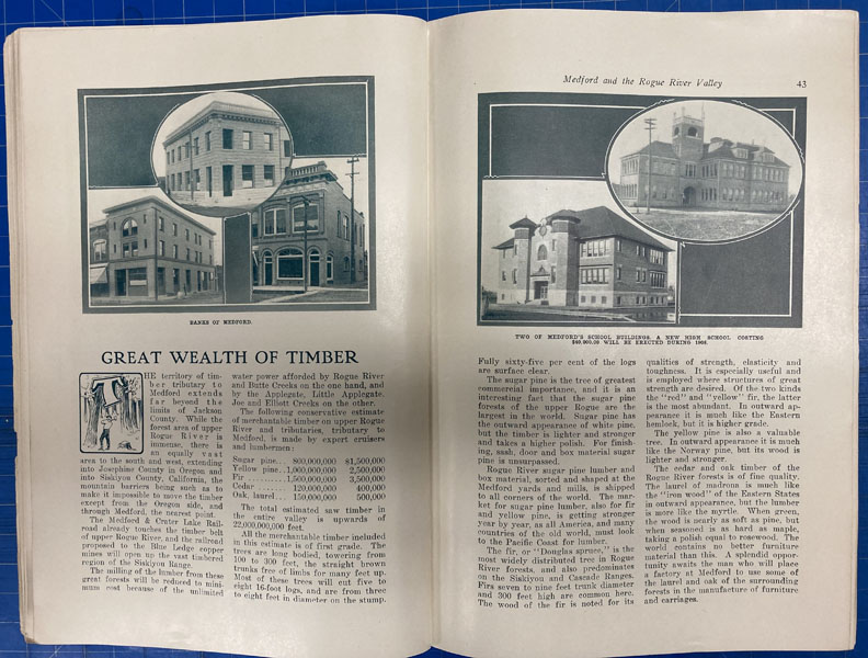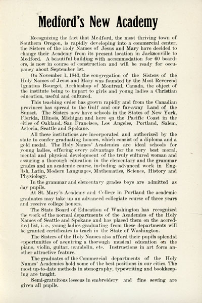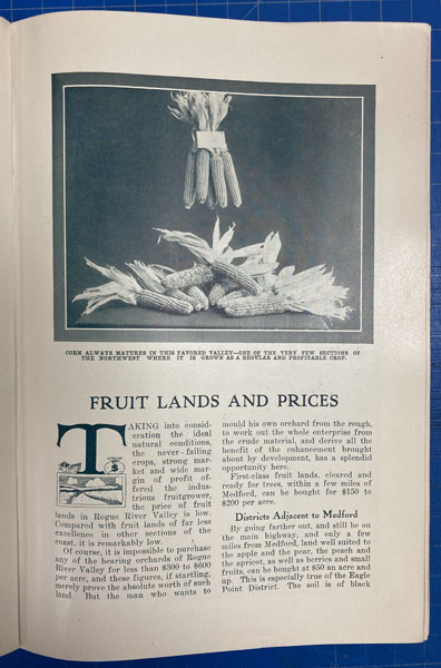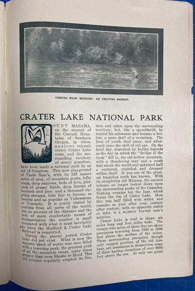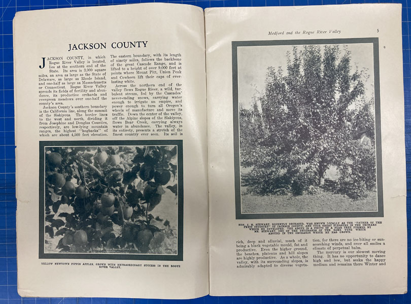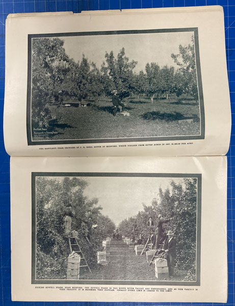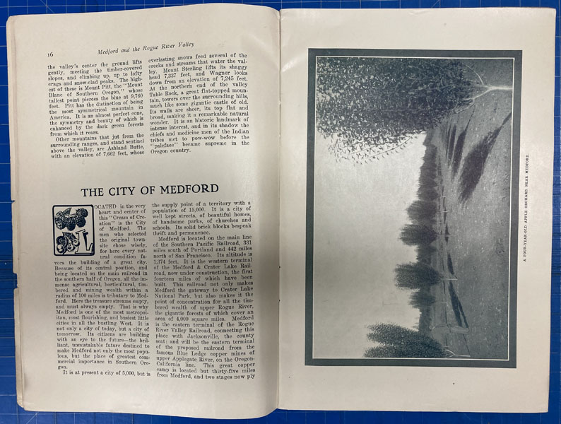 First edition. 10" x 6 7/8" in colorful pictorial wrappers showing an apple tree on the front wrapper. 64pp. Illustrations. Contents. Foreword. Printed in green ink. Double-column text. Chapters on Jackson County, the City of Medford, Rogue River apples, pears, timber, mines, copper and coal mining, hunting and fishing, grains and alfalfa, gardening and truck farming, Crater Lake National Park, livestock, irrigantion, water power near Medford, fruit lands and prices, Rogue River fruit records, etc. Laid in is a 10" x 6 3/4" sheet advertising Medford's New Academy, the Sisters of the Holy Names of Jesus and Mary. Scraping to spine and with 1" closed tear to side edge of first 16 pages (not affecting text), light soiling and light wear to the extremities. Very good.