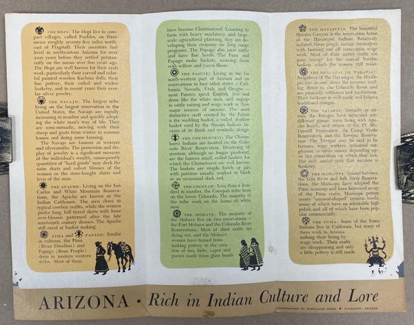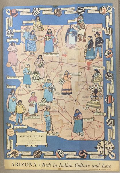 44.5 x 30.5 cm [17 1/2" x 12"] printed two sides colorful brochure that folds to 9 1/4" x 4" size. One side is an attractive map by the artist, Don Perceval (1908-1979), who grew up in California and studied at Chouinard Art Institute, London's Royal College of Art and the Heatherley Art School. In addition to his work as a commercial artist, he also served on the faculty of Chouinard Art Institute and the Art Department of Pomona College. Perceval first visited the Hopi mesas of northern Arizona in 1927, and later did a series of railway posters for the "Santa Fe." Map of Arizona that locates the numerous Native American homelands, pueblos, and reservations. Decorative illustrated border of Arizona pottery types. The other side provides information to meet Arizona's Indians and to learn a bit about their culture and lore. Light wear to each corner from having been hung on a wall for viewing, else an attractive, very good copy.