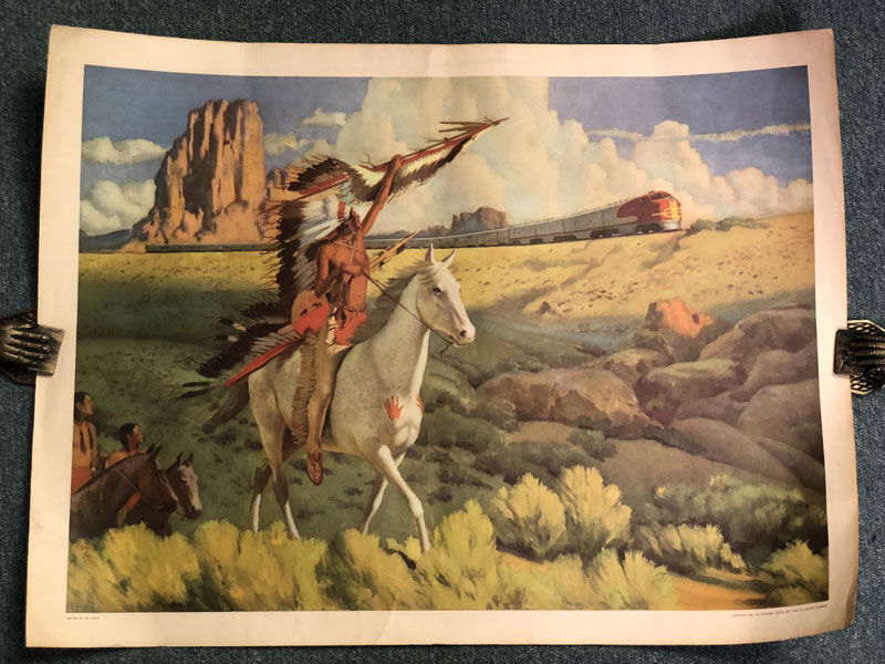 18" x 24" color print. An attractive print issued by the Atchison, Topeka, and Santa Fe, celebrating the railroad's sleek, modern trains, but also highlighting the disruptive force of technology on a formerly pristine frontier. It was said of the Transcontinental Railroad (completed in 1869), that it destroyed traditional conceptions of time and space by being able to move people and goods so quickly through vast distances. In this image, created eighty years after the laying of the Golden Spike, time and space are once again disrupted, as modern train design confronts an image of three Native Americans who appear more at home in the mid-nineteenth century than the post-World War Two era. The print shows a long Super Chief passenger train cutting through a southwestern landscape with Monument Valley-type buttes rising in the background and three Native Americans in the foreground. The most prominent of the three Indians, atop a trotting white horse, wears a long flowing headdress, and holds a spear aloft, pointed toward the train. Though the chief is moving forward the train is drawn in such a way as to clearly outpace him, alluding to the triumph of modern technology over the abilities of man and beast. The meaning of the chief's gesture seems a bit unclear to this viewer - it is hard to tell whether he is saluting the train or cursing it. A captivating western image. Neat, expert repairs on verso to the four corners. Short repaired tear in upper margin (not affecting the image), repaired two-inch tear in lower left, just into the image. Very good.