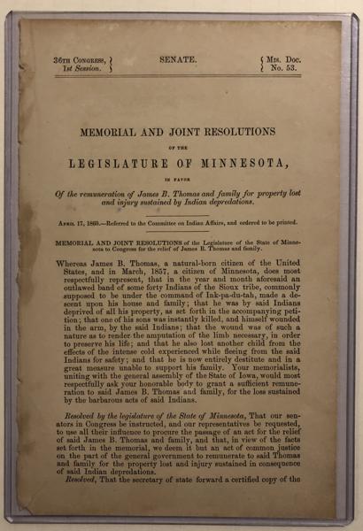 First Edition. Disbound. 2pp. Senate. 36th Congress, 1st Session. Mis. Doc. No. 53. In March, 1857, in the immediate aftermath of The Spirit Lake Massacre, committed by renegade Sioux Indians led by Ink-pa-du-tah, the home of James B. Thomas was attacked by these Indians, killing his son, and wounding James so severely in the arm that it required amputation to save his life. He also lost a child to the effects of intense cold experienced while fleeing from these Indians. Light staining to the disband edge, else fine.