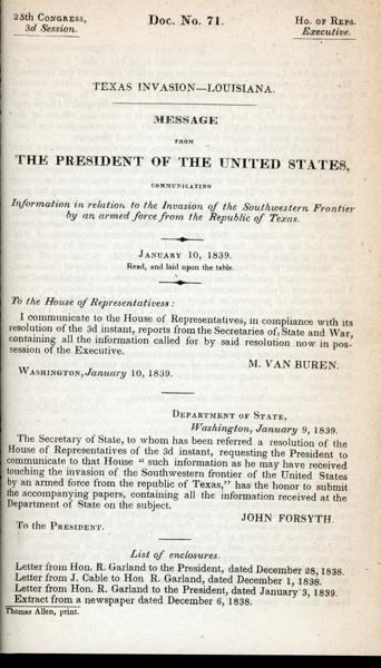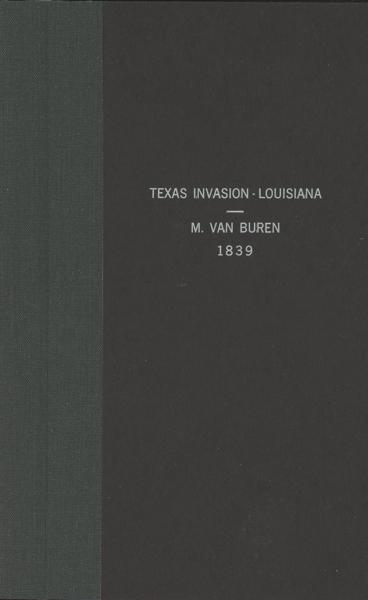 First edition. 8vo. Binder, 6 pp. Executive House of Representatives Document No. 71, 25th Congress, 3d Session, 1839.. Interesting record of correspondence between Louisiana, a part of the United States, and Washington in regard to the "invasion" of Louisiana by a large group of armed Texians. The "invasion" was by a group of 75-100 armed men from Texas who were in pursuit of Caddo Indians. They were intent on disarming the Caddoes, who they claimed were committing depredations in Texas, with arms provided by their U.S. agent. Scarce record of an interesting event in the history of the Republic of Texas. Fine copy housed in quarter cloth and boards binder with titles stamped in silver on the front cover.