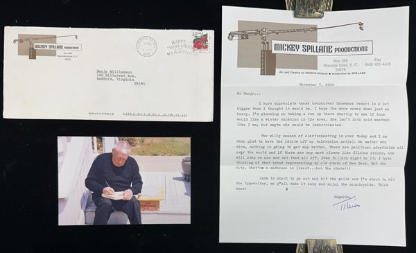 Long typed letter, dated November 7, 2000, on Mickey Spillane Productions letterhead with matching envelope. Spillane makes his political opinions clear, stating (brief excerpt): "The silly season of electioneering is over today and I am damn glad to have the idiots off my television set(s). No matter who wins, nothing is going to get any better. There are political minefields all over the world and if there are any more clowns like Clinton around, one will step on one and set them all off." Fine condition. Accompanied by a color photograph of Spillane signing a book.
