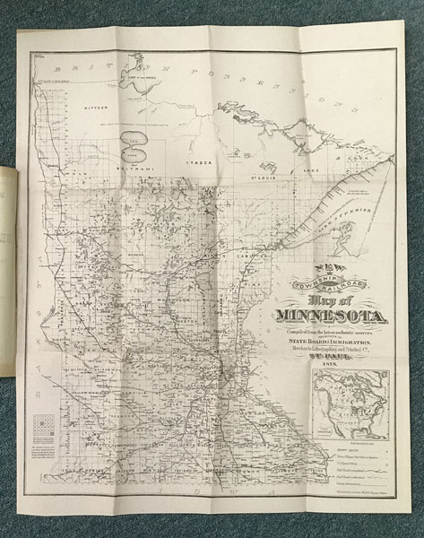 First edition. 8vo. Printed wrappers, 88 pp., introductory, many land advertisements, map. Large folded map bound-in at the front and opens to 17" x 22 1/4." It is named the New Township Railroad Map Of Minnesota and is compiled from the latest authentic sources for 1878. Identified on the map are county seats, towns, villages post offices and stations, U. S. land offices, railroads completed, railroads unfinished, and county boundaries. The map is in fine, unused condition. The booklet is touting the resources and advantages of Minnesota to entice businesses and settlers to the area. Among the advantages offered are railroad, manufacturing, commercial, agricultural, timber lands, minerals, etc. as business opportunities. Much information is provided regarding lands offered for sale, homestead laws, payment terms, etc. Also provided is information on agricultural prospects for wheat, potatoes, oats, barley, rye, buckwheat, cattle, sheep and wool, etc. Small stamp of Chicago & North-Western Railway at top of front cover, else a fine copy of an informative booklet.