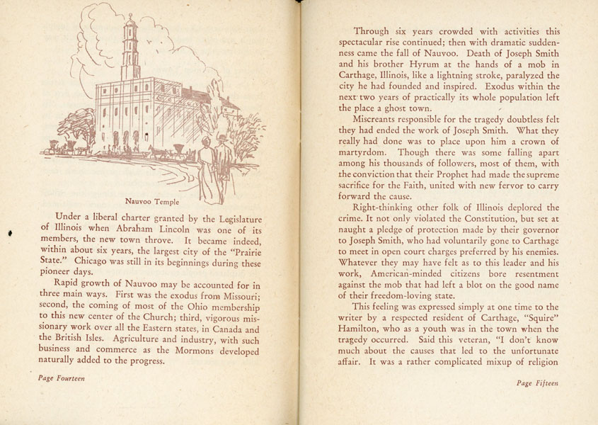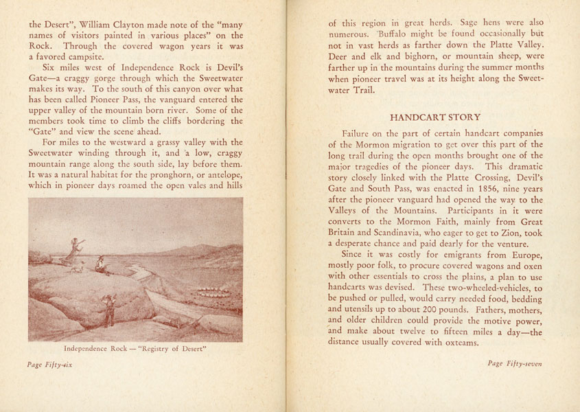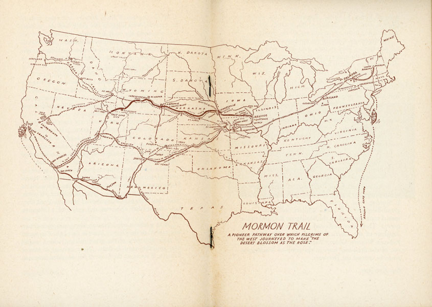 7" x 5" in pictorial wrappers. 95 pp. Foreword. Illustrations. Map. This history of the Mormon Trail, the route taken by Mormons from Nauvoo, Illinois, to the Great Salt Lake. Beginning in 1846, thousands of Mormons followed existing pioneer trails through Iowa. They established winter quarters in Omaha, Nebraska. From there the first wave of settlers followed the Platte River west across Nebraska and into Wyoming, at which point the Mormon Trail frequently coincided with the Oregon Trail. The Mormon Trail broke south just to the west of the Continental Divide, and it terminated to the southeast of the Great Salt Lake. Soiling to wrappers along with splits to head and toe of spine and light wear to edges. Good plus.