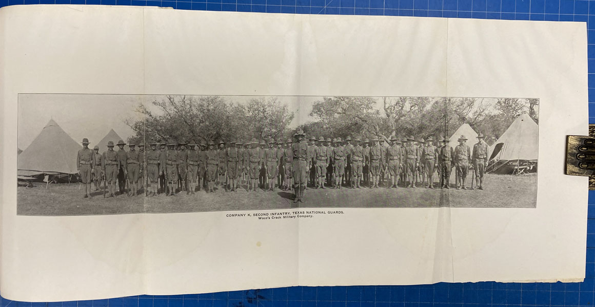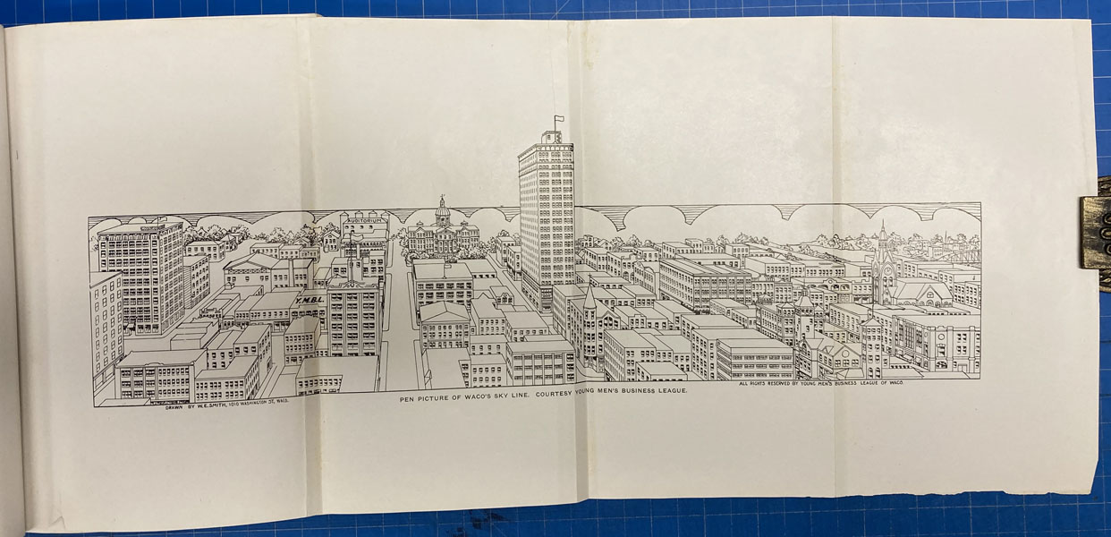 First edition. 8vo. Pictorial printed wrappers, 265 [4] pp., frontispiece [photograph of Waco High School], illustrated from photographs, general index, index to the illustrations. Numerous photographs. Two three panel foldouts of: Photograph of Co. K. 2nd Infantry, Texas National Guard [and] A Pen and Ink Drawing of the Waco Skyline. Printed wrappers with an image of the main building of the Texas Cotton Palace insert at the top of the wrapper. Begins with a brief history of Waco describing the origins of its name, removal of the Indians, early organization of the city and adoption and achievements of the commission form of government. There are brief sketches of some of the major businesses including the Young Men’s Business League, public utilities, police and fire departments, the school system, health department, public parks and playgrounds, charitable institutions, etc. Includes a complete financial report that covers several pages. Enhanced by the numerous photographs showing prominent businesses, schools, churches, homes as well as street views. Light creasing to the wrappers and light wear to the extremities. Small scrape to picture of the Texas Cotton Palace on front cover. Internally, there are small chips to some pages edges, old damp stains to some pages, All things considered; it is a good plus and tight serviceable copy. Very scarce with OCLC showing one copy.