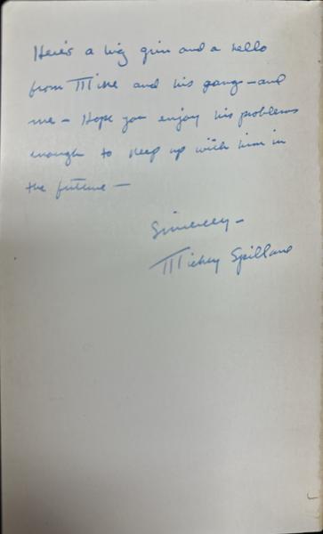 First paperback edition. Signet Books 791. Inscribed by the author on the inside front cover to founder and publisher of Penguin Books and The New American Library, Kurt Enoch, and from his personal collection. "Here's a big grin and a hello from Mike and his gang (and me) -- Hope you enjoy his problems enough to keep up with him in the future -- Sincerely, Mickey Spillane." Light wear to the spine ends, lightly rubbed along the spine, corners and extremities, and a faint crease to the top edge of the rear cover, else a bright, near fine copy in color pictorial wrappers. "Kurt Enoch (22 November 1895 – 15 February 1982) was a German-born publisher who co-founded Albatross Books in Germany and Penguin Books Inc. and New American Library in the United States, bringing high-quality paperback fiction and non-fiction to the mass market in those countries." ---- Wikipedia. A tremendous association copy. A letter of provenance is included with this title.