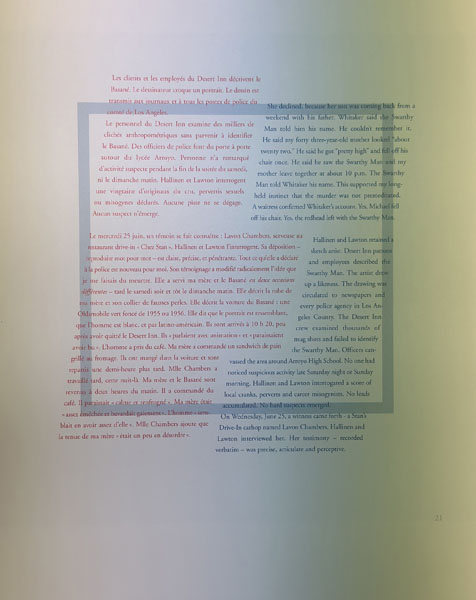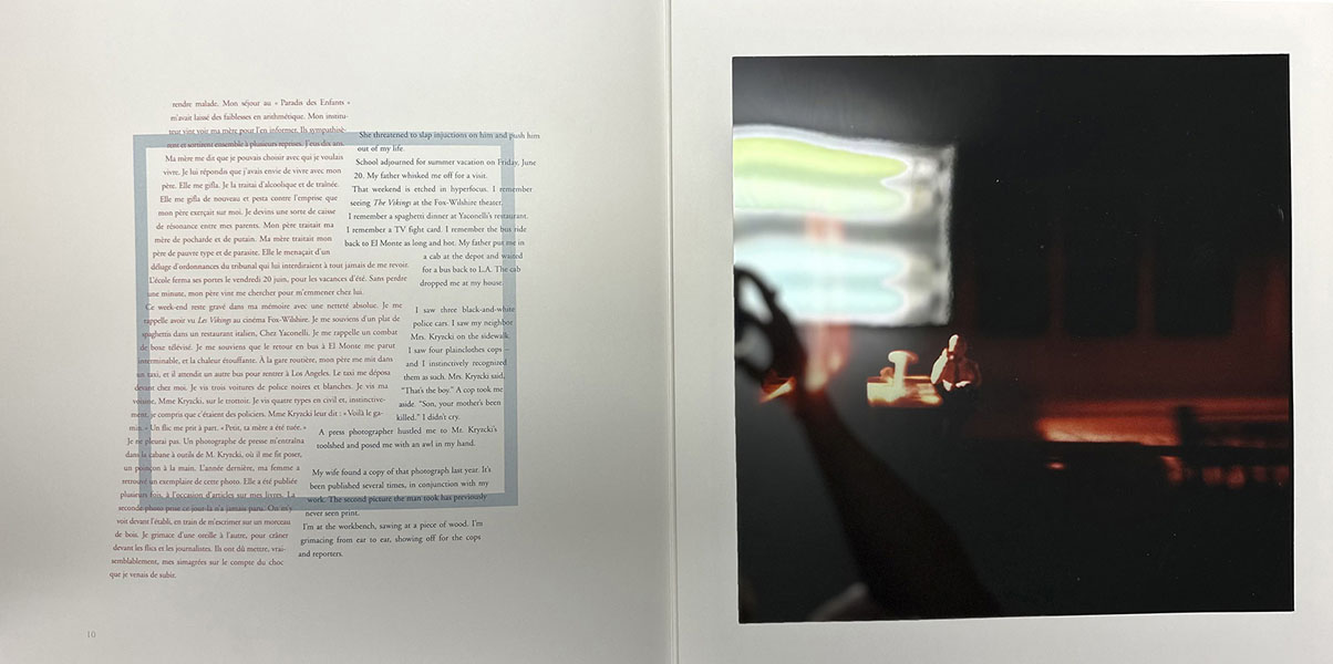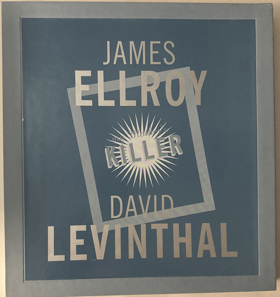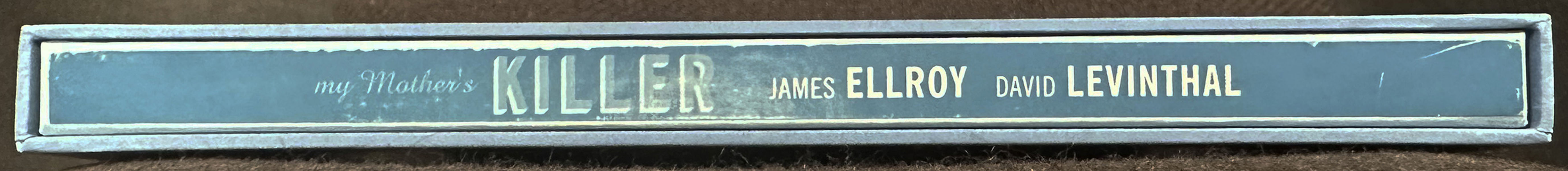 First edition. Square folio (32.5cm); two bifolium leaves (title leaf and colophon), together with six tri-fold leaves, each containing an archivally housed color Cibachrome print (silver dye bleach/dye construction, measuring 11.5" x 10.5"), each signed and dated by Levinthal; housed in a blue paper-covered tri-fold portfolio with mounted hand-painted silver gelatin print (7.75" x 9.75") and paper-covered slipcase, with printed title label inset on front; parallel text in French and English. One of 55 numbered copies signed by the author and photographer. This copy unnumbered, but Levinthal's own copy, inscribed by him to American bookseller Glenn Horowitz inside the title leaf, by way of thanks for mounting an exhibition of his work: "To Glenn – with all my thanks and very best wishes – David Levinthal." A collaborative interpretation of the events surrounding the unsolved 1958 murder of James Ellroy's mother, Geneva Hilliker Ellroy, as recreated by noted photographer David Levinthal in a series of stylized miniature tableaux. Ellroy originally published "My Mother's Killer" in GQ magazine in 1994 – a searing account of how and why he decided to reopen his mother's unsolved case. Levinthal's photographs were produced specifically for this edition. OCLC notes 2 holdings (NYPL, Smithsonian). This is the first separate edition of Ellroy's groundbreaking piece, which he first wrote for GQ magazine in 1994. The article was, I believe a springboard for what would eventually become his 1996 book, My Dark Places, which is perhaps one of the great pieces of investigative journalism / true crime published in quite some time. The origins of that book are in the GQ article, the text of which appears in this very elaborate fine press edition. The text is laid out in an interesting way (with an eye toward design), printed in two colors (red and blue) on thick white card. As good as our high-res scanner is, I will just say this: it doesn't do the photographs justice. They are extremely dark, brooding, and beautiful to look at; Levinthal's tableaus are pretty incredible. The photographs, which are all protected by clear archival Mylar, almost look "wet" due to the development process. Really quite stunning. There has not been any other edition of this text outside of GQ magazine. I know I mentioned it, but it bears mentioning again: this was the photographer's own copy, inscribed and gifted to the recipient, who mounted an exhibition of Levinthal's photographs in his East Hampton gallery, sometime in the late 1990s - early 2000s. Contents and portfolio are Fine; a thin crack to top upper right edge of slipcase, else it is Near Fine.