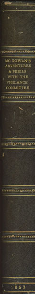 First edition. 12mo. Original pictorial wrappers, viii, [9] - 240 pp., introduction, eight full-page illustrations [rather than the normally collated seven] and one text illustration. The 1857 edition is "exceedingly rare" according to Six Guns 1408. A gripping account of Edward McGowan's adventures and perils while persecuted Sby the San Francisco Vigilance Committee by who he was indicted for his involvement in the killing of James King in 1856. This account also has a report of his trial which resulted in his acquittal. Ned McGowan was one of the truly colorful characters of early California. Six Guns 1408 says "Scarce." "Contains some material on Jack Powers, with whom the author hid out when the vigilance committee was after him." Wheat Gold Rush 132 says, "The 'other side' of the San Francisco Vigilance Committee of 1856. Ned McGowan escaped from the Committee amid many exciting and astonishing adventures. The reprint published by Thomas C. Russell [San Francisco, 1917] is now almost as hard to come by as the original." Graff 2611 says, "Ned McGowan, as his Narrative proves, and as Carl I. Wheat indicates in his continuation of the work, was a prime rascal, one of the truly colorful characters in California during the middle of the last century." Eberstadt 106: 109a says: "The story, by one of the chief figures of the San Francisco feuds and violence in which Casey, the Kings, Lewis, District Attorney Byrne and other noted men were involved, it is written with the utmost frankness and fearlessness. It is one of the few original prime sources on this important chapter of early California history." Spine panel professionally reinforced, else a solid and tight very good copy housed in a cloth chemise and placed into a quarter leather and cloth clamshell case with raised bands and titles stamped in gilt on the spine.