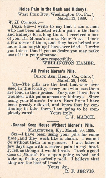 First edition. 5" x 3" bright colorful trade card. The front of the card offers a unique lithograph of the daring investigative journalist Nelly Bly. On the back of the card are testimonials from customers about the Morse pills. Elizabeth Cochran Seaman, known by her pen name Nellie Bly, was an American journalist. She was also a writer, industrialist, inventor, and a charity worker who was widely known for her record-breaking trip around the world in 72 days. She was a pioneer in her field, as well as a player in the early feminist and Suffrage movements, and she launched a new kind of investigative journalism. This card is one of a series of six about Bly. Store stamp to top of the front of the card else very good.