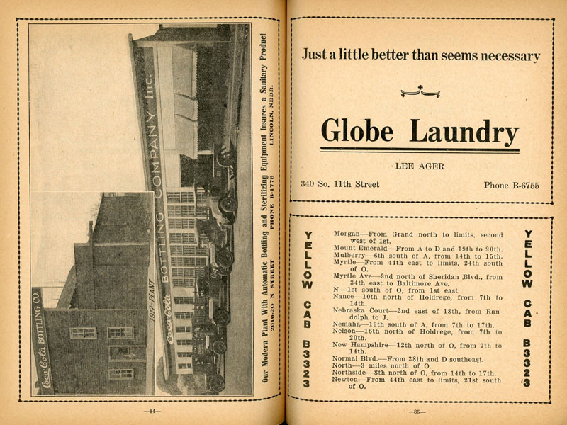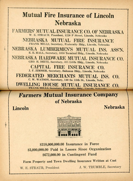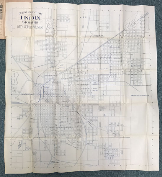 Large, folding map. 25" wide x 28" high. Affixed to inside of rear wrapper. Stiff printed wrappers, 120pp., profusely illustrated. Many business advertisements. "Showing Havelock, University Place, College View, Bethany, With Index and Guide to Streets, General Information, Points of Interest and Reliable Business Directory." Includes information about churches, the new capitol building, schools, and a chart of statistical information regarding Lincoln and its business community. Some minor splitting at a few folds, else a near fine copy of the map, in very good wrappers.