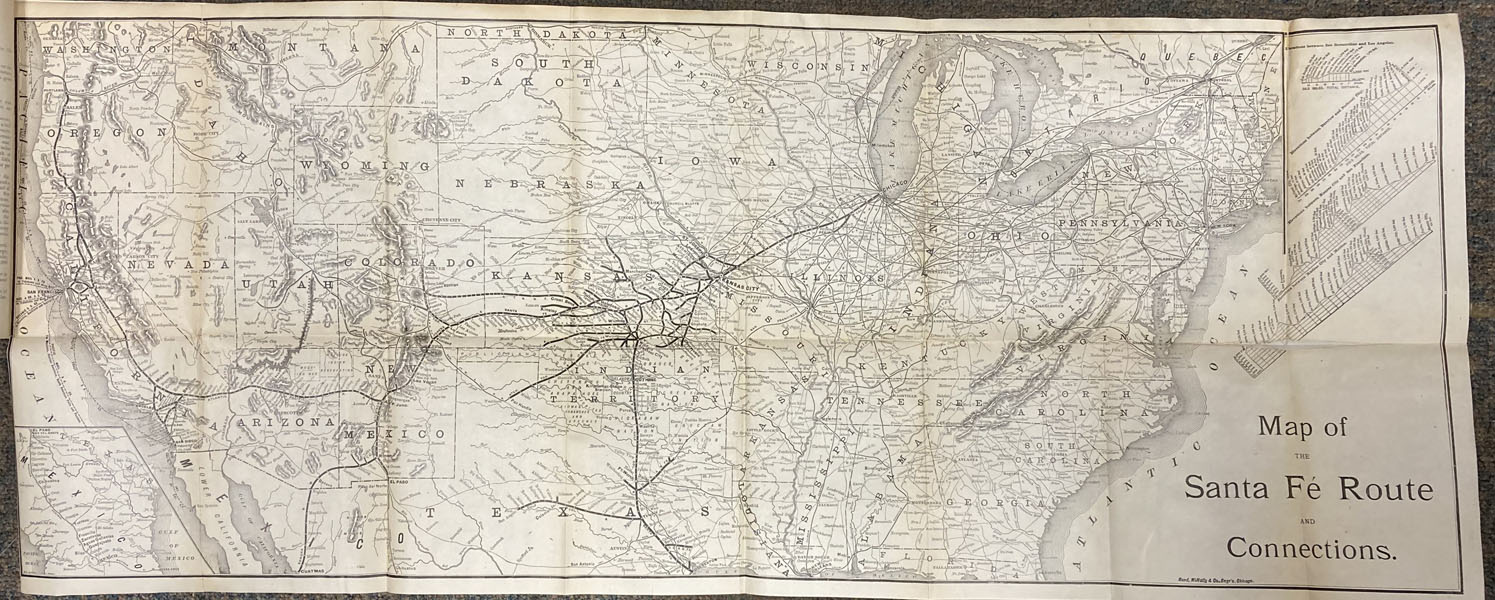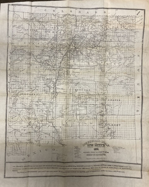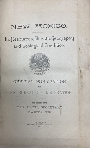 First edition. 8vo. Pictorial wrappers, 216 pp., two lithographed folding maps: [1]. "Official Map Of New Mexico, 1890. Prepared By The Bureau Of Immigration." [2]. "Map Of The Santa Fe Route And Connections." An uncommon promotional for the territory of New Mexico, printed in Santa Fe by the Bureau of Immigration, and including large folding maps of New Mexico and its land grants, and of the Santa Fe Railroad and connections. The text covers a wide range of subjects, such as the land and its energy resources, farming, cattle raising, manufacturing, irrigation projects, the New Mexico Hot Springs, schools, population statistics, and a long section of detailed descriptions of the New Mexico territory, county by county. Herd 857 says "Scarce." The first map shows the location, boundaries and grantees of all of the numerous early Spanish and Mexican land grants, prepared by the Bureau of Immigration, of which Max Frost was a member of the Executive Committee. The status of land grants in New Mexico at this time was a matter of contention, and the detailed information given on this map would have been of interest to current and prospective land owners in the territory. The second map by Rand McNally shows the routes and extensive connections along the Santa Fe Railroad from Chicago to Missouri, and then snaking into Kansas and throughout the Southwest. This work is scarce to rare. Rebacked with both the original front and rear covers laid-down, separation along the spine joint of the front cover has been expertly repaired, small closed tear to fore-edge of front cover expertly repaired, else a very good clean and solid copy.