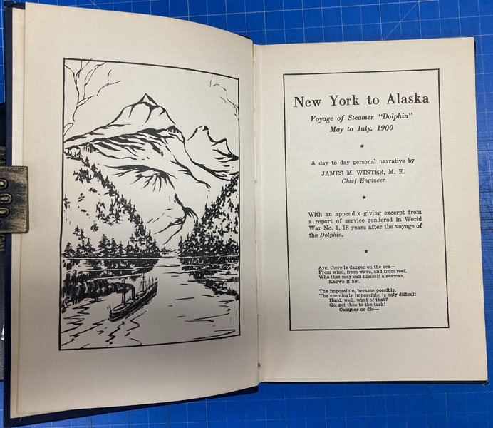 First edition. 8vo. Blue cloth, titles stamped in gilt on the front cover and spine, vii, 8 -80 pp., frontispiece, introduction, illustrated, map, appendix. First edition of this memoir reproducing the day-to-day logbook of the Steamship Dolphin which after being built at W.& A. Fletcher Co. of Hoboken, New Jersey, and outfitted, was sailed around Cape Horn, to Seattle, and then Northward to Alaska. The original ship’s log was presented to President Roosevelt in 1943 for his museum and library at Hyde Park, New York. Also featured is information beginning on page 62 - 80 from John Muir’s "Travels in Alaska "(1915). From the library of former California State Librarian, Gary Kurutz. Minor rubbing to spine ends and corners else a near fine bright copy.