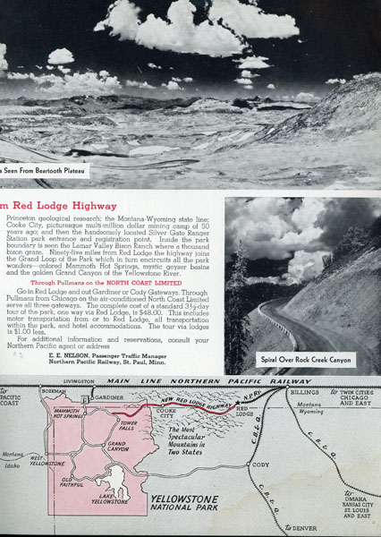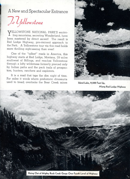 11" x 8" in pictorial wrappers. [12] pp. Illustrations. The Red Lodge Highway begins at Red Lodge, Montana, and and winds its way to the northeastern entrance of Yellowstone National Park, awing tourists with its astonishing views. Numerous black and white photos throughout. Bottom corner of center page shows what appears to be a coffee stain. Light wear to extremities. Very good.