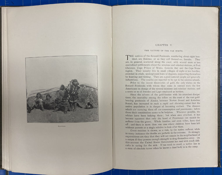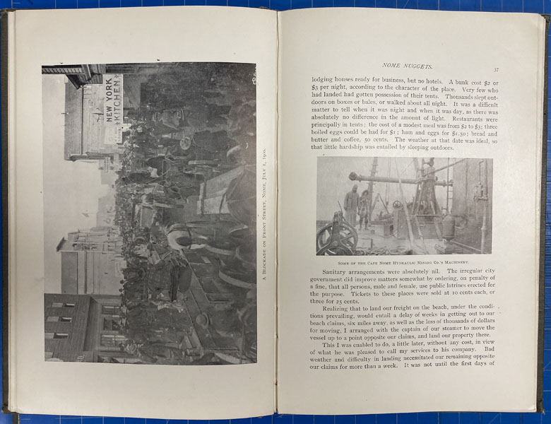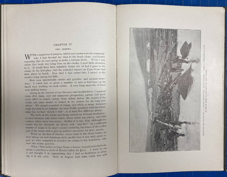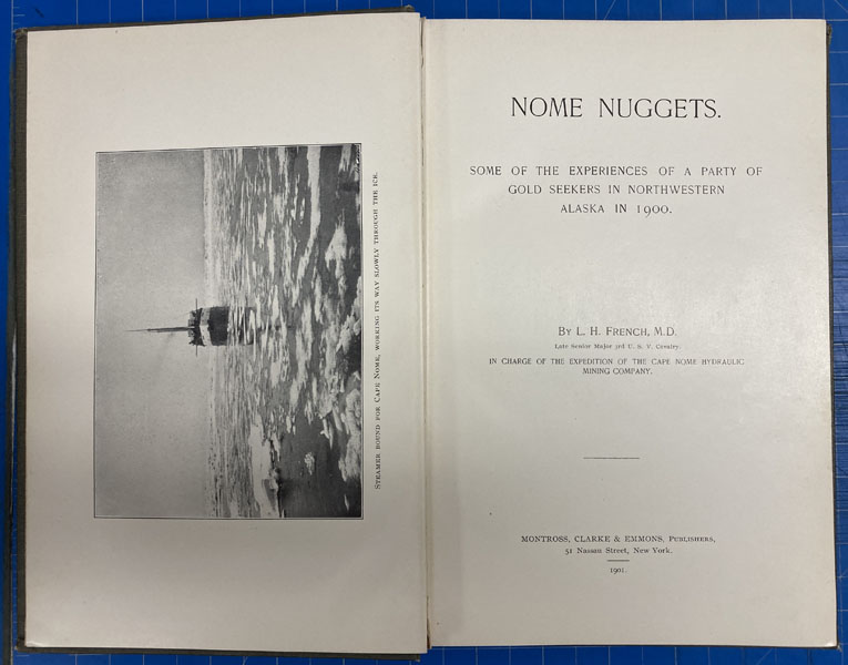 First edition. 8vo. Pictorial gray cloth, embossed gold nuggets on front cover, titles in black & white on front cover, decorated front and rear endpapers, xxi, 22 - 102pp., frontispiece, preface, the author's preface, illustrated from photographs, appendix. This superb and vividly written account by French, Senior Major, 3rd U.S.V. Cavalry, and former Spanish-American War Rough Rider, of the Nome gold rush. French and his companions from New York & New England had formed the company and he was in charge of the expedition for the ape Nome Hydraulic Mining Company, but quickly discovered that the richest deposits had been worked out, and their equipment proved useless. They then moved operations to Anvil Creek, where with rockers and sluice boxes they struck paydirt. Light wear to the spine ends and corners, else a very good copy. From the library of former California State Librarian, Gary Kururz.