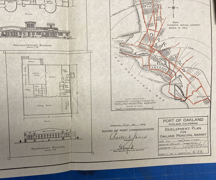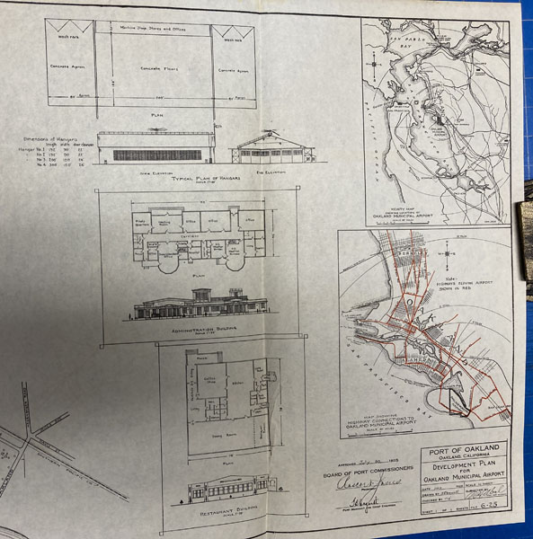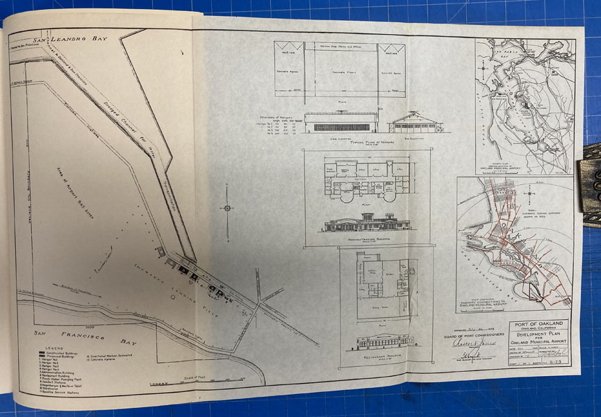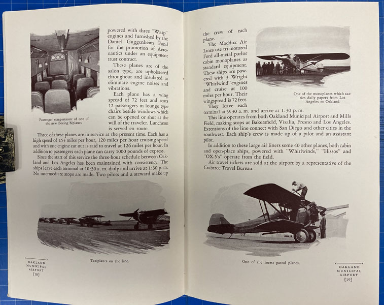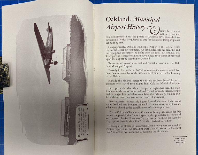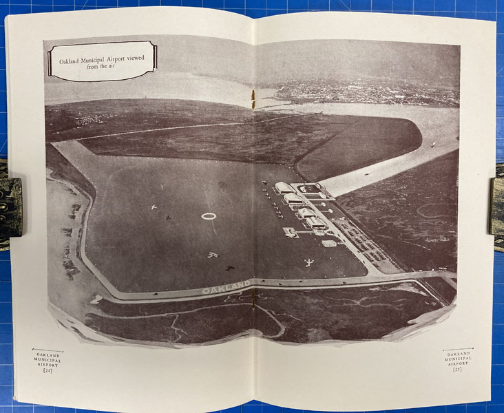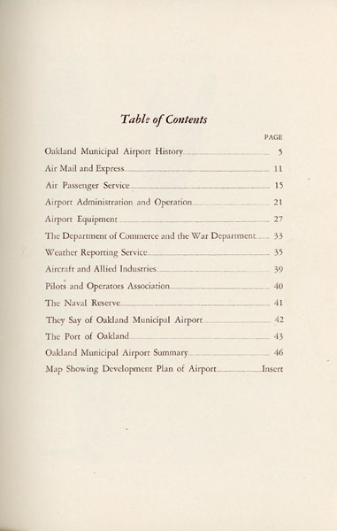9" x 6" in pictorial wrappers printed in yellow and blue. 48pp. Foreword. Contents. Illustrations. Map. Text printed in brown ink. History of the airport followed by information on air mail and air express, passenger service, airport equipment, the weather reporting service, the Pilots and Operators Association, the Naval Reserve, the Port of Oakland, the Department of Commerce and the War Department, etc. Numerous photographs throughout. At center of book is a 2-page bird's eye view of Oakland Municipal Airport. Attached to inside rear wrapper is a 9" x 15" map of the Port of Oakland, layout of hangars, layout of administration building, layout of restaurant building, a vicinity map showing the location of the Oakland Airport and a map showing highway connections to the Oakland Airport.