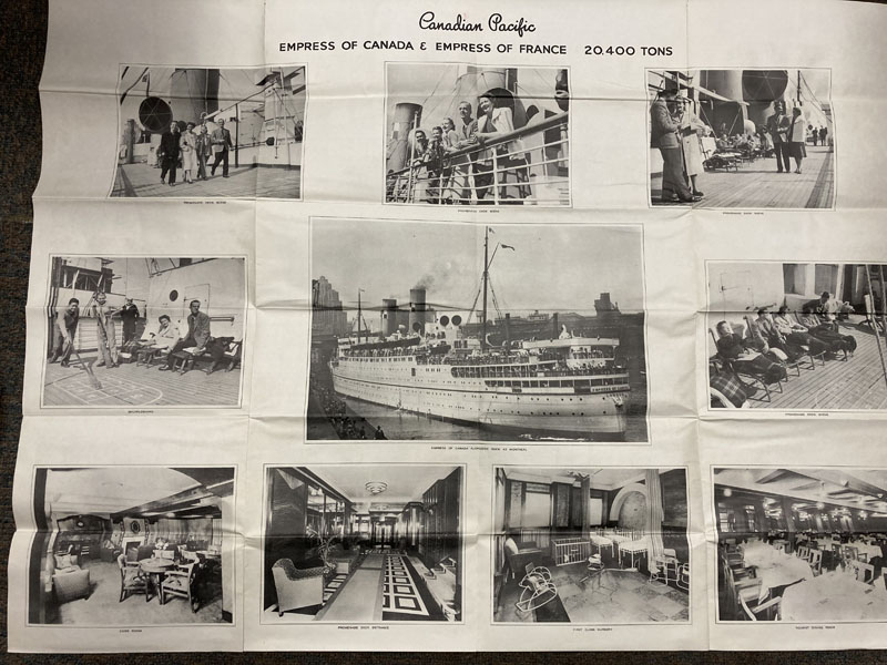 First edition. Double Atlas Folio. 30 3/4" x 41", folded to 5 1/4" x 10 1/4." Illustrated on recto and verso, with 6 large color deck plans delineating decks, amenities, cabins, for first class and tourist class passengers, together with black and white photo illustrations. Scarce deck plan for the Empress of Canada (SS Duchess of Richmond) and the Empress of France (SS Duchess of Richmond), after the two 20,400 tons ocean liners had been refitted following World War II. Initially launched as the "Mini-Empresses," but also referred to as the "Drunken Duchesses" as they tended to roll in heavy seas. They were designed to allow travelers to sail further up the St. Lawrence River to Montreal, as well as to those wishing to travel into the Great Lakes. The ships were fitted with enough capacity to hold 400 first class passengers and 300 tourist class passengers. The ships entered service from Liverpool to Montreal in July, 1947, and September, 1948, respectively. Sadly, the Empress of Canada caught fire in 1953, and after re-floating was scrapped in Italy the following year. The Empress of France was refitted in 1958/1959 and continued to sail until retired in 1960. Some age toning, slight closed tear at one fore-edge, and with creasing at folds. Very good.