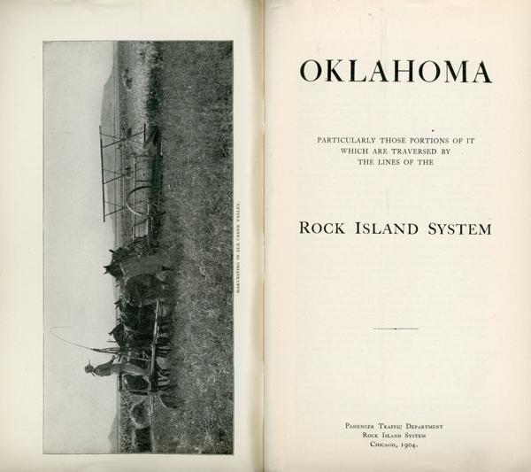First edition. 8vo. Original color printed wrappers, 64 pp., frontispiece, illustrated from photographs, double-page map of Oklahoma at the center, advertisements. Map at the center is titled "Map of Oklahoma Showing the Lines of the Rock Island System."