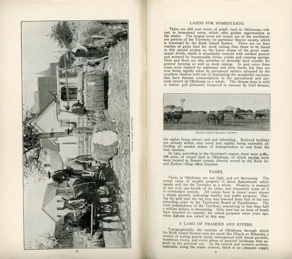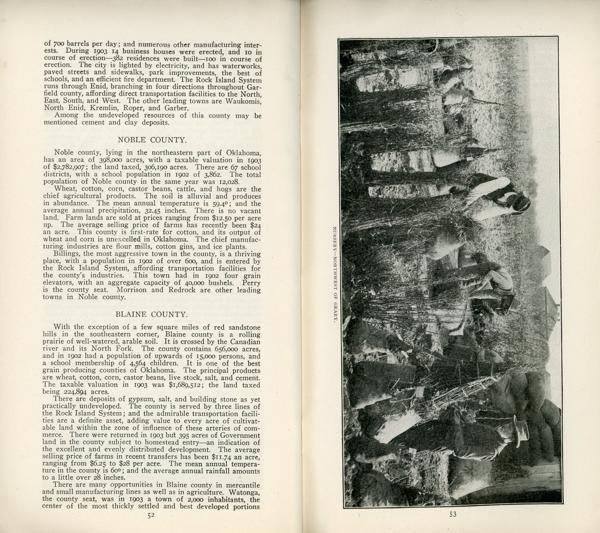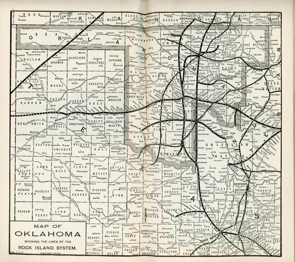 Provides a sketch of Oklahoma to set forth conditions as they are, and with possibilities of the future to encourage growth and expansion. Information is provided on opportunities for growth in agriculture, livestock raising, field crops such as wheat, sorghum, alfalfa, flax, etc., flour mills, fruit growing, banks and investments, undeveloped natural resources, schools, religion, county histories, etc. The map shows the lines of the Rock Island System.