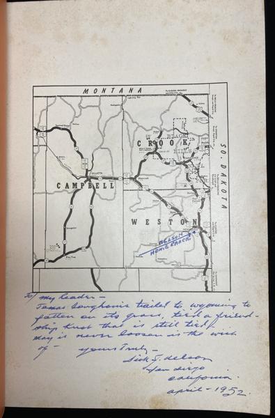 First edition. 8vo. Inscribed and dated on the front page below the map by the author: "To my Reader, Texas Longhorns trailed to Wyoming to fatten on its grass, tied a friendship knot that is still tied. May it never loosen is the wish of Yours Truly, Dick S. Nelson, San Diego, California, April, 1952." The author also notes the Nelson Home Ranch on the map. Pictorial wrappers, 104 pp., frontispiece (map), Illustrated from photographs. Nelson, who lived in Wyoming from childhood, spent much of his adult life with the Chicago, Burlington & Quincy Railroad, and his book draws on first-hand experience, personal reminiscences, archival records, and local anecdotes to offer a view of frontier life in a region that was once primarily open range "cow country."