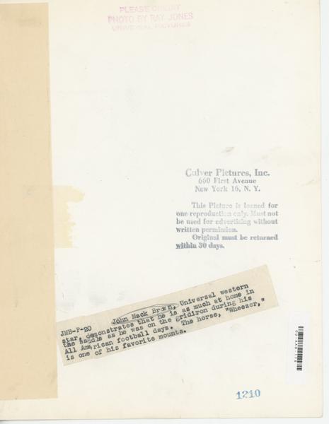 Vintage 8" x 10" publicity photograph of Johnny Mack Brown rearing his horse Wheezer by photographer Ray Jones. On verso of the photograph is a stamp crediting Jones as the photographer, a mimeo snipe, and a provenance stamp. From the archive of noted Hollywood still photographer Ray Jones, who was born in Wisconsin on January 1, 1901. Jones worked for Paramount Pictures in the early 1930s and went on to become the head of the still photography department at Universal Pictures in 1935. He remained employed there until well into the 1950s. Johnny Mack Brown (1904-1974) was a star college football halfback at the University of Alabama, who after appearing on Wheaties cereal boxes in 1927, was shortly thereafter signed by MGM Studios. From 1927 to 1965 he appeared in over 150 films, primarily westerns, which began with Brown starring in director King Vidor's "Billy the Kid" (1930). From 1930 to 1933 Brown was MGM's highest paid actor. Among some of his other notable films include "The Big Trail" (1930), "Montana Moon" (1930), "The Secret Six" (1931), "The Last Flight" (1931), "The Lone Star Trail" (1943), "The Ghost Rider" (1943), "Forever Yours" (1945), and "Flame of the West" (1945). Near fine, attractive photograph.