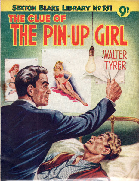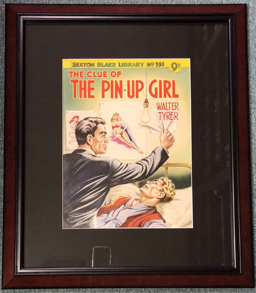 Original 11 1/2" x 15" colorful image, tastefully matted to 18 1/2" x 22" size. Included with the artwork is a copy of the actual book written by Walter Tyrer and titled The Clue Of The Pin-Up Girl and is Sexton Blake Library publication number 351, a digest-size paperback original. Sexton Blake is a fictional character, a detective who has been featured in many British comic strips, novels and dramatic productions since 1893. Sexton Blake adventures were featured in a wide variety of British and international publications (in many languages) from 1893 to 1978, comprising more than 4,000 stories by some 200 different authors. Blake was also the hero of numerous silent and sound movies, radio serials, and a 1960s ITV television series. The first issue of The Sexton Blake Library was published on 20 September 1915, entitled "The Yellow Tiger" and written by G.H. Teed. Sexton Blake was known as "The Poor Man's Sherlock Holmes," and many of the Sexton Blake stories rival the Sherlock Holmes stories in their quality, yet Holmes has remained in the public eye while Blake has been allowed to slip into obscurity by all except for a few devotees. This is a fine, bright piece of original artwork, suitable to be framed.