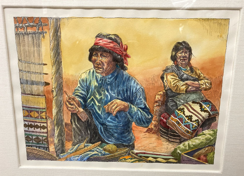 Original matted and framed color artwork done by Ernest Franklin and signed by him. The image size 8 3/4" x 6 1/2" and matted and framed it is 15" x 17 3/4." The color picture depicts a Navajo man sitting while he weaves with a woman, who is peeved with his efforts. This pictures a Navajo taboo as Navajo men are not supposed to weave, which is why the woman appears to be peeved. In 1991 a book illustrated by Franklin and titled "Navajo Taboos" was published and we believe this artwork was completed at that time. Fine condition.