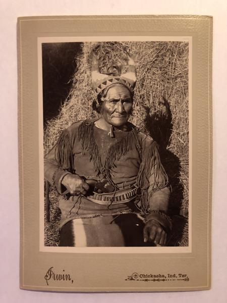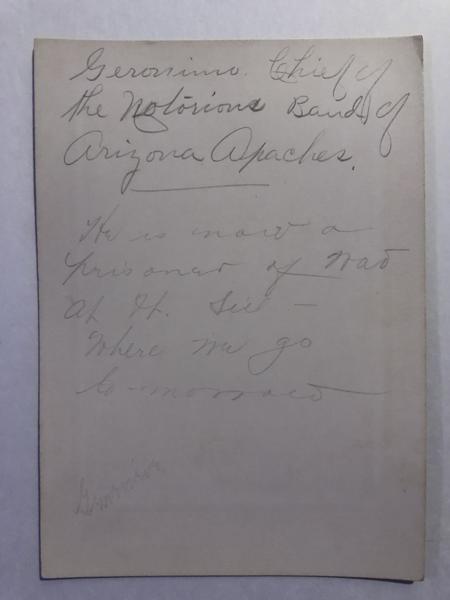 Original Photograph of famous Apache warrior, Geronimo. Cabinet Card. Image: 3.875" x 5.5". Mount: 5.25" x 7.375". Geronimo, most famous of all Apache warriors and chiefs, was born, of Chiricahua parentage, on the upper Gila River in 1825. As a young man, he served Cochise, hereditary chief of the Chiricahuas, and Mangas Coloradas, chief of the Mimbrenos. After the death of Cochise in 1874, raids into Mexico increased. In 1877 Geronimo was captured and sent to San Carlos reservation, where he remained through the late 1870's. In 1881, after the battle at Cibicue Creek, Geronimo and nearly 80 others left San Carlos for Mexico. Geronimo returned in 1882, forcing many Mimbrenos to join him in Mexico. In late 1882 General Crook was ordered to return to Arizona to subdue the Apaches, who were raiding and killing throughout much of southern Arizona and northern Mexico. Finally in March, 1886 Geronimo met with Crook at the Canyon de Los Embudos, agreeing to return to the United States. Two days later Geronimo changed his mind and escaped back into the mountains of Mexico. In July, 1886 Geronimo finally surrendered, and was sent to Fort Pickens, in Florida, with many of his followers. In 1887 he was sent to Mount Vernon, Alabama, where many of the Apaches died due to tuberculosis and other illnesses. In 1894 the Kiowa and Comanche Indians offered to share their reservation with the remaining Apaches, to which the government agreed. Geronimo remained a prisoner of war, at Fort Sill, Indian Territory until his death in 1909. This photograph was taken at Fort Sill in 1898 by Tom Burdick, a civil engineer with the U.S. Medical Department. Geronimo sits on bales of hay dressed in a buckskin shirt with long fringes on chest, sleeves, and shoulders. A blanket with bold vertical stripes covers his lap. Around his waist is an ammunition belt, with his right hand gripping a large pistol tucked in his belt. On his head he wears a unique horned headdress. It is a bold image of Geronimo, brightly lit by the sun. A handsome image. The mount is tan, textured board with "Irwin, Chickasha, Ind. Ter." printed in gilt along bottom edge. Neatly written in pencil on the back is: "Geronimo, Chief of the Notorious Band of Arizona Apaches. He is now a prisoner of war at Ft. Sill--where we go tomorrow". This cabinet card must have been purchased and immediately placed in a dark protective space. This photograph is pristine...flawless, including the mount!! A rare and striking image of this notorious Apache warrior!