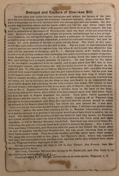Original Photograph of "Cherokee Bill" and the Posse that captured him. Cabinet Card. Image: 5.375"x3.875". Mount: 6.5"x4.25". Mount has scalloped edges. This photograph was taken in Wagoner, Indian Territory on January 29, 1895. There are townsfolk at the edges and background of the image, but the focal point is "Cherokee Bill" Crawford Goldsby, surrounded by 5 Marshals, Deputies, and posse members. On the verso of this Cabinet Card is a lengthy, detailed account of "Cherokee Bill's" capture and the specific roles of each of the 5 captors that appear in the image, entitled: "Betrayal and Capture of Cherokee Bill". U.S.Marshal Ike Rogers, an acquaintance of Cherokee Bill lured Bill and his girlfriend to Roger's home for dinner and to spend the night. The next day Rogers hit Bill with a fireplace iron, then Rogers, Clint Scales, and Rogers wife jumped on Bill and were able to temporarily get him in handcuffs, and ultimately under guard of their Winchesters. They took Bill to 5 miles by wagon to Nowata, where he was taken under the control of U.S. Marshal Bill Smith. They went by train to Wagoner, where this photograph was taken by a local photographer, before moving on to Fort Smith. To "Cherokee Bill's" right stands Marshal Dick Crittendon, flanked by his brother and posse member, Zeke Crittendon. To Bill's left stands posse member Clint Scales, Marshal Ike Rogers (who Bill refused to allow to stand next to him), and U.S. Marshal Bill Smith. After much more trouble from "Cherokee Bill" in jail in Fort Smith, Bill was ultimately hung on March 17, 1896. Feeling that Bill had been betrayed by acquaintance/friend Marshal Ike Rogers, Bill's brother Clarence Goldsby shot and killed Ike Rogers on April 20, 1897. The account printed on the back of the mount is interesting and entertaining. Printed at end of the account is "Copyrighted by E. D. Macfee,...", with the ed in copyrighted crossed out and "applied for" handwritten in ink...indicative of an early imprint of this image. Image shows some minor fading, else in near fine condition. Provenance: From the Collection of Robert G. McCubbin.