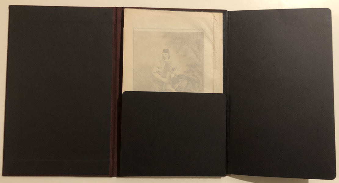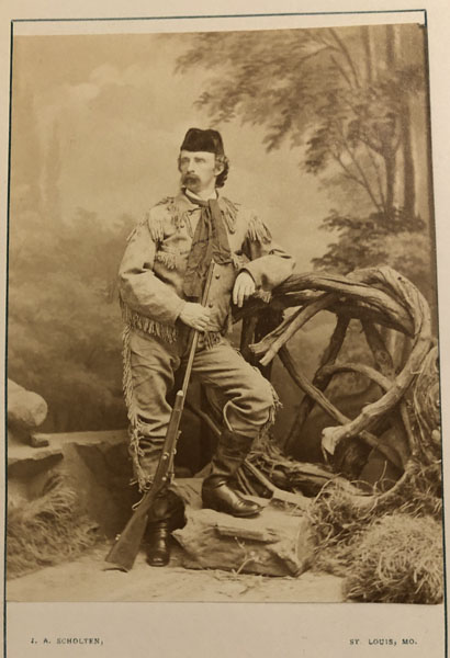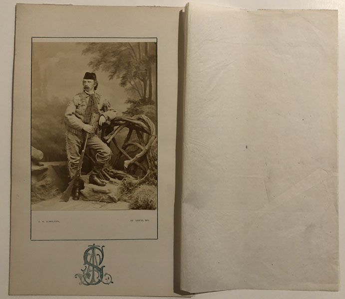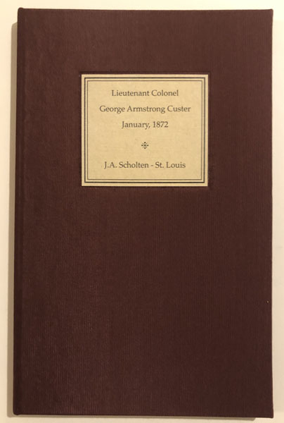 Original Albumen Portrait Photograph. Photograph: 4.125" x 5.625". On original printed Studio Mount with tissue guard, 5.875" x 9.625". Taken circa January 24,1872. This iconic image of Custer depicts him in buckskins, with hunting rifle and wearing his trademark red kerchief. At the time, Russia's Grand Duke Alexis was visiting the United States for a "western adventure" and had specifically requested Custer for a buffalo hunt guided by William F. "Buffalo Bill" Cody with the expedition being led by Lieutenant General Philip H. Sheridan. This original version of Scholten's photograph was distributed in very limited numbers as a tipped-in addition to the Philadelphia Photographer, a small publication distributed to professional photographers. A Rare Original Image, widely copied and issued in cabinet format after the Battle of the Little Big Horn. In very clear, clean, Fine condition. Protected in a custom folding-case portfolio.