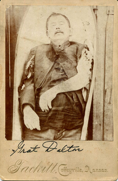 THE BOLDEST BANK ROBBERY ATTEMPT IN AMERICAN HISTORY ... EIGHT MEN DEAD & SEVERAL OTHERS WOUNDED! On the morning of October 5, 1892, Bob, Grat, and Emmett Dalton, along with fellow gang members Dick Broadwell and Bill Powers rode into Coffeyville, Kansas, with ambitious plans to rob the C.M. Condon Co. Bank and the First National Bank ... at the same time! Fortunately for him, gang member Bill Doolin was left behind due to his lame horse. Although the Dalton Brothers had all briefly served as Deputy U.S. Marshals in Oklahoma and Kansas, shortly thereafter they had become notorious for cattle rustling and a variety of robberies, including several train robberies in 1891 and 1892. In addition to the Dalton Brothers, most other gang member got together while working as cowboys on Oscar Halsell's HX Bar Ranch in Oklahoma. Known to many Coffeyville citizens, the Dalton's wore disguises, but as they approached the banks they were recognized by some citizens and the alarm was spread. Emmett and Bob entered the First National Bank while Grat and the other two entered the Condon Bank With $21,000 in a grain sack, Emmett and Bob left the First National Bank but were immediately fired upon by several citizens. They headed out the back door into "Death Alley." In the deadly fusillade of gunfire four of the gang were killed, the City Marshall and 3 citizens were killed, and 3 other citizens, as well as Emmett Dalton, were wounded. Cabinet Cards. Photographs/Mounts as follows: Bob ... 3.875" x 5.5"/4" x 6;" Grat ... 3.875" x 4.875"/4.375" x 6.5;" Dick ... 4" x 5.625"/4.25" x 6.5;" Bill ... 4" x 5.25"/4.25" x 6.5;" and Emmett ... 4" x 5.5:/4.24" x 6.5." All but Bob Dalton issued by Tackitt, Coffeyville, Kansas. Three have stamp on verso stating: WARNING! Copyright is applied for on these photos. - - - Mrs. C. Tackett. All five rare original photographs offered as a set. Emmett Dalton, the "Sole Survivor" of the gang received a severe rifle shot wound to his arm, but despite the opportunity to escape, he returned into heavy gunfire to help Bob, when he received 21 buckshot from a citizen's double-barreled shotgun. Badly wounded, Emmett survived, refusing doctor's recommendations to amputate his arm. He received a life sentence in the Kansas State Penitentiary. In 1907 Emmett was pardoned by a petition from citizens of Coffeyville. He married his longtime sweetheart, moved to California, and in 1931 published When The Dalton's Rode, which subsequently became a movie. Emmett died in Los Angeles in 1937. From the Collection of Robert G. McCubbin.