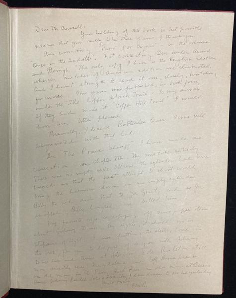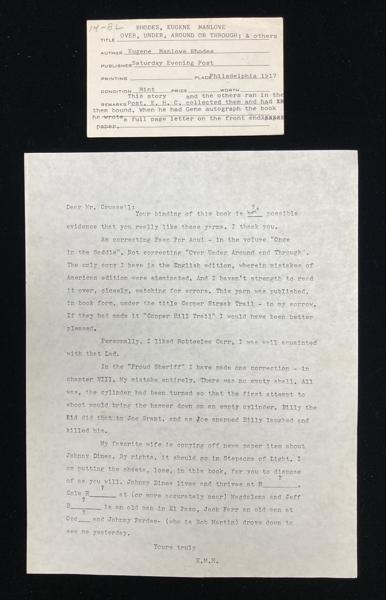 Rhodes responded with a warm ~275-word manuscript ffep inscription ("Your building of this book is best possible evidence that you really like these yarns. I thank you.") and advises he is correcting 'Paso Por Aqui' (prior to its publication in the book 'Once in the Saddle'), He laments "to my sorrow" 'Over, Under, Around or Through' was published in book form with the title 'Copper Streak Trail' (preferring "Copper Hill Trail" and sharing "Personally, I liked Robt E. Lee Carr, I was well acquainted with that lad)."