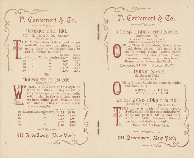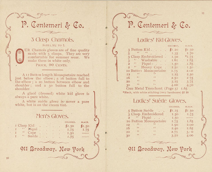 First edition. 5-1/2" x 3-1/2" in light burnt orange wrappers. Burnt orange ink. Preface. 12 pp. Described are several different types of P. Centemeri & Co. gloves including the sizes and colors to include the "3 Clasp Embroidered Kid," "3 Button Kid," "3 Clasp Washable," "Mousquetaire Kid," "Men's Gloves," "Ladies' Suede Gloves," and more. Mail Order instructions and guarantee. On the rear wrapper is a list of branch stores and agencies in leading cities and the following quote "To insure the genuineness of our first quality Gloves, our name is branded in full in the left hand glove, thus:" One line down is a picture of their logo. Very good.
