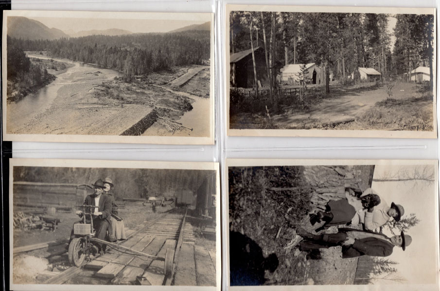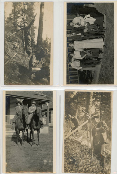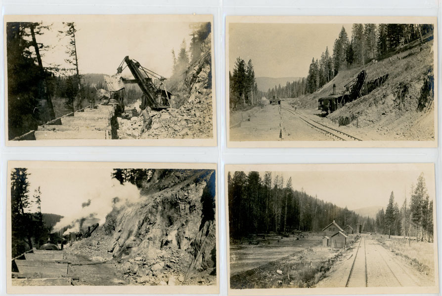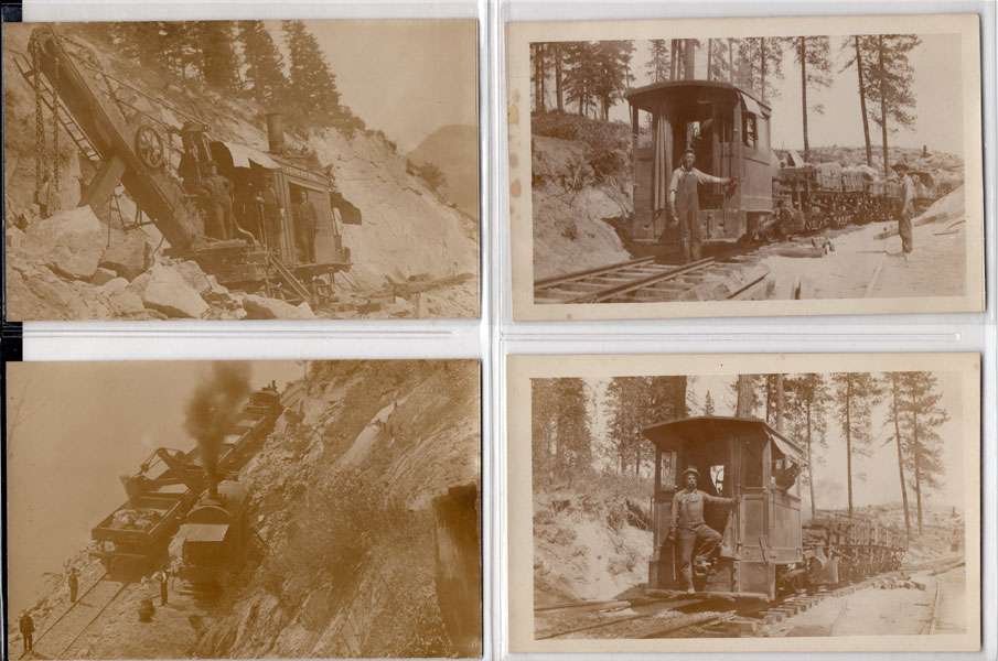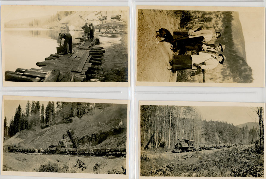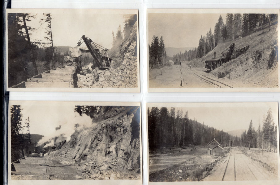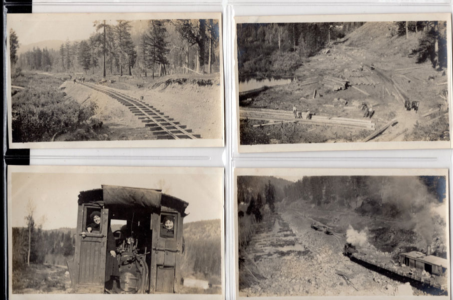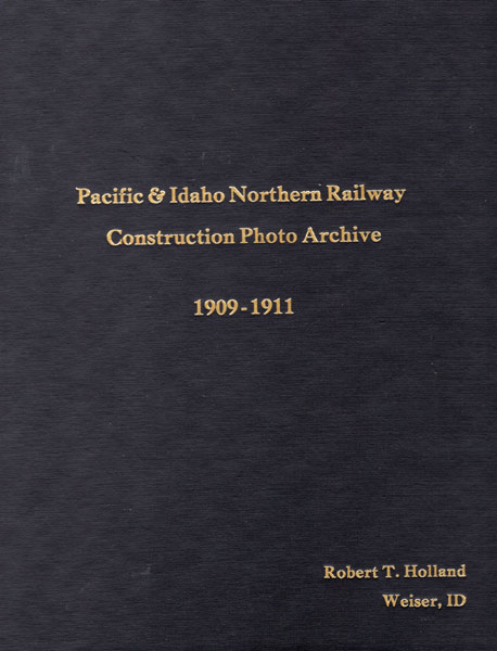 First edition. Black cloth three-ring notebook with titles stamped in gold gilt on the front cover. An exceptional archive of 97 photographs, Real Photograph Postcards, and Cyanotypes documenting the construction of the P & IN Ry along the Weiser River from Milepost 76 north of Glendale, ID to New Meadows, ID, and then the scenic Payette Lake area. These images include locomotives, engineers, survey crews, sternwheelers, excursions on RR hand cars, massive steam shovels in operation, and more. Archive of 67 original photographs sized 3 1/2" x 5 1/2," 29 Real Photograph postcards (3 cyanotypes), sized 3 1/2" x 5 1/2," 1 color linen postcard, 9 with ink annotations, pencil annotations, and notes on versos. These uncommon photographs & cyanotypes offer an extraordinary view of the construction of the Pacific & Idaho Northern Railway, a successful shortline railroad which had purchased the rights and interests, including surveys, grades, and right-of-way of the Weiser, Idaho & Spokane Railway in 1899, later sold in 1914 to the Oregon Short Line Railroad. By 1909, the P&IN Ry was beginning the construction from Evergreen, Idaho to New Meadows, Idaho where the company was establishing the New Meadows Depot, which would allow the P&IN Ry to serve as a "farm-to-market" railroad. In addition, they were operating six Baldwin4-6-0steam locomotives (four of them new), Nos. 100-105. These excellent photographs show surveyors at work, engineering crews, steam locomotives, supplies being hauled in by sternwheelers and horse-drawn covered freight wagons, grading, and laying of railroad ties, temporary corduroy log railroad track beds over water, construction of dikes, railroad trestles, and more. Many of the photos show Edwardian-era "Western" women riding the railroad construction hand cars, hamming around with the survey and track building engineering crew, shooting rifles, and posing for the photographer. Notes on the back of several of the photographs and postcards provide invaluable identifying details to the participants, especially the civil engineers and survey crew contracted with the J. G. White & Co., Inc. out of New York. Those identified include the project's chief engineer was Stuart Macaulay French (1878-1961), civil engineer who directed railroad building and irrigation projects for J. G. White & Co. from 1909-1920, before leaving for Seattle, and Sedro Woolley as mining engineer; Karl L. Keyes (1880-1972) a local civil engineer based out of Weiser, ID who began his career with the Chicago, Milwaukee & St. Paul RR, and then contracted for the P&IN Ry project; Howard McClymonds Yost (1885-1966), civil engineer who specialized in concrete work, road building, and later with U.S. Army; Charles B. Shirley, Jr. (1890-1963), a Weiser, ID surveyor, who later became a banker; Harry Spooner (b. 1875), accountant with the Oregon Short Line RR, and the P&IN Ry in Weiser, as well as the survey Levelman A.W. Bainbridge (fl. 1900-1920), surveyor and engineer out of Colorado Springs, and later Los Angeles, CA. Holland (b. 1892) was a young Vermonter whose family worked as engineers and surveyors with the Central Vermont Railroad, who went West to Idaho where he worked on the track building project for the P&IN Ry, later with the Lehigh Valley Railroad, and serves with the 13th Engineers Construction Battalion, and later 143rd Co. Transport Engineers with the A.E.F. during and after World War I. Two of the postcards included in this group were mailed to his older sister Joanna Florence Holland (1889-1925), a Vermont public school teacher. Most of the photos have strong contrast with a few sepia-tinted images with minor fading, overall a collection in near fine condition. See: Don Strack, Pacific & Idaho Northern Railway Overview, Utah Rails (2010); The Progress of Sub-Division in Idaho under the Carey Act, The Irrigation Age, Vol. XXIV, No. 1, pp. 55-56; Hiram Taylor French, History of Idaho: A Narrative Account of its Historical Progress (1914).