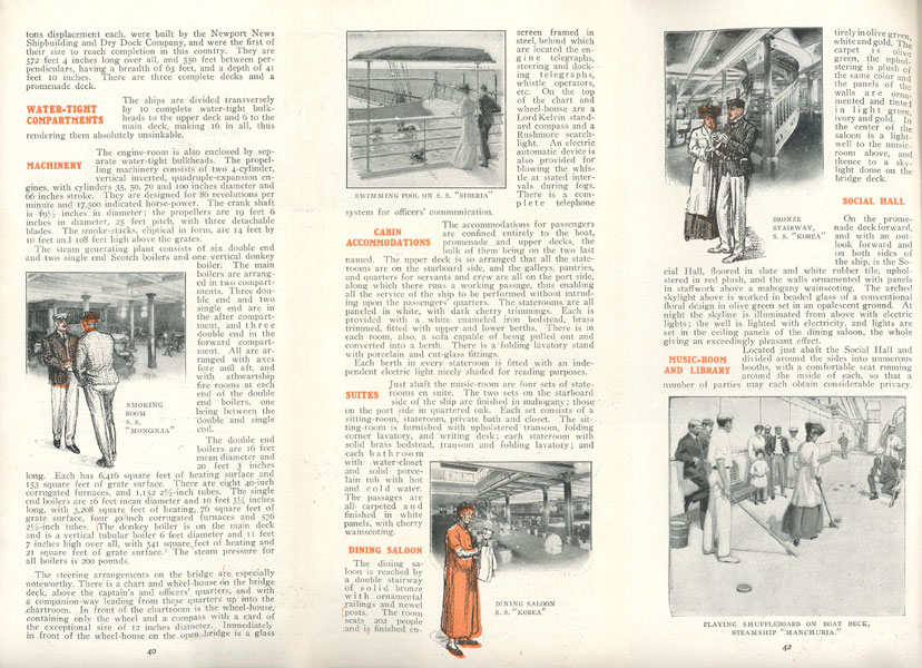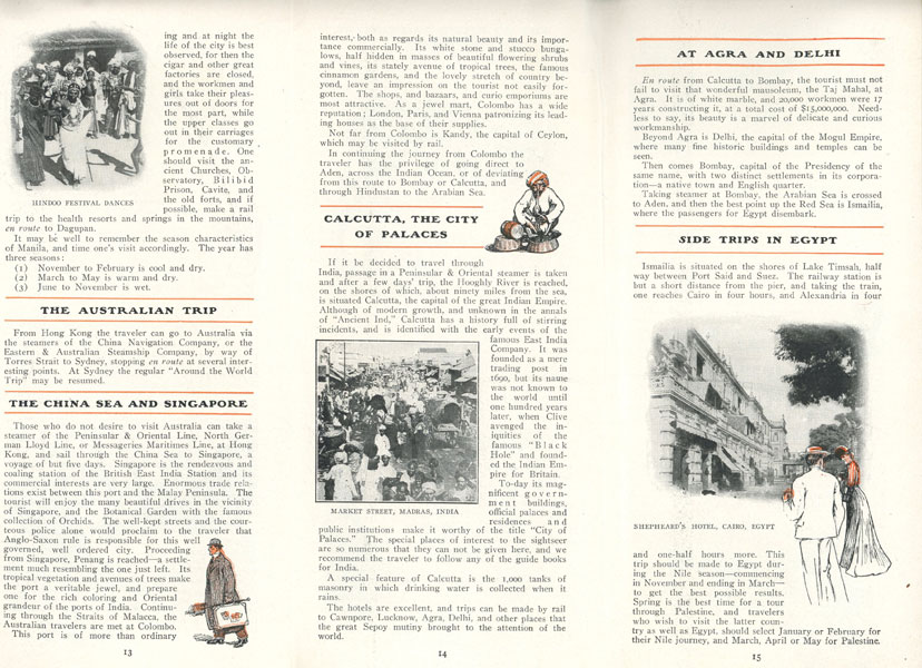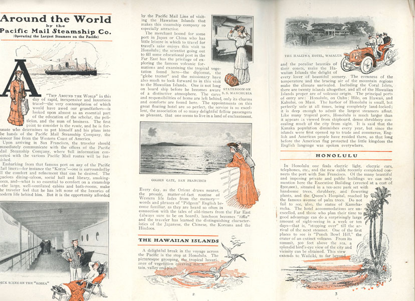 9" x 12" tri-fold color, pictorial wrappers, folds to 9" x 4," 44 [1] pp., illustrated from photographs and line drawings. Includes cabin plans for steamers "Mongolia," "Manchuria," "Korea," "Siberia," and "China, itineraries, conditions of passage, timetables, route map, exchange rates. Describes comforts of the ships (cabins, suites, dining, social hall, music room and library, smoking room, etc.) and includes sections on Honolulu and Hawaii; Japan; Shanghai and China; the Philippines; the China Sea and Singapore; Calcutta; Agra and Delhi; Side Trips to Egypt; Cairo; Nile Trips; Africa, Across the American Continent (Chicago, Salt Lake City, San Francisco); and famous California Resorts. This is a well-presented booklet and provides a great deal of information that is helpful to the traveler. Very good copy.