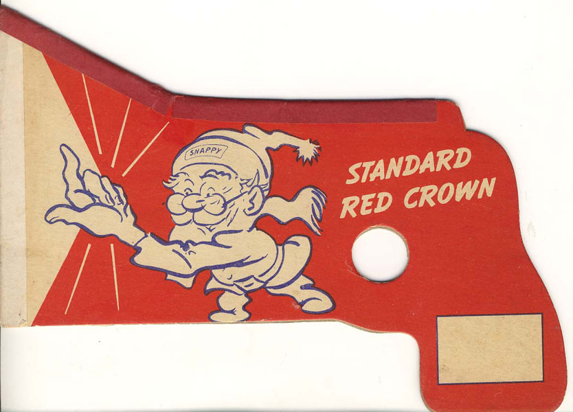Approximately 8" x 6" bright colorful boards in the shape of a revolver and showing an illustration of an elf-like creature snapping his fingers and with the name "Snappy" on his hat. Printed in Red and blue. In order to use this toy gun, the child would hold the grip of the revolver, place his finger in trigger hole and swing downward quickly. A paper flap would come out of the muzzle of the gun, making a loud pop. On this particular paper popper, the paper flap shows "Starts Just Like That!" Lightly soiled and with light wear to the extremities. Very good.