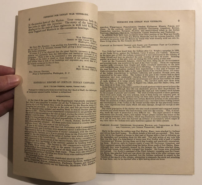 First Edition. Separate, Self-Wrappers, stapled. 37pp. House of Representatives. 63rd Congress, 2nd Session. Report No. 1084. A proposal before the House for pensions to be paid to survivors of certain Indian wars from 1865-1891. Pages 8-32 present "Historical Resume of Certain Indian Campaigns", written by Capt. S. J. B. Schindel, General Staff. A very interesting, and surprisingly detailed account of numerous campaigns, battles, and wars fought with various Indian tribes between 1865 and 1882. Bibliographies of Dustin and O'Keefe reference a 1916 printing. We offer the earlier printing of 1914. Some rusting to staples, else a near fine copy of this rare printing.