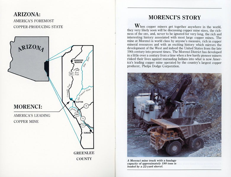 First edition. 8vo. Color stiff wrappers, n. p. [16 pp. including covers], illustrated, maps. Details the Morenci Copper Mine located in southeastern Arizona. This is America's leading copper mine and Arizona is America's foremost copper-producing state. Excellent photographs of the total operation. Fine copy.