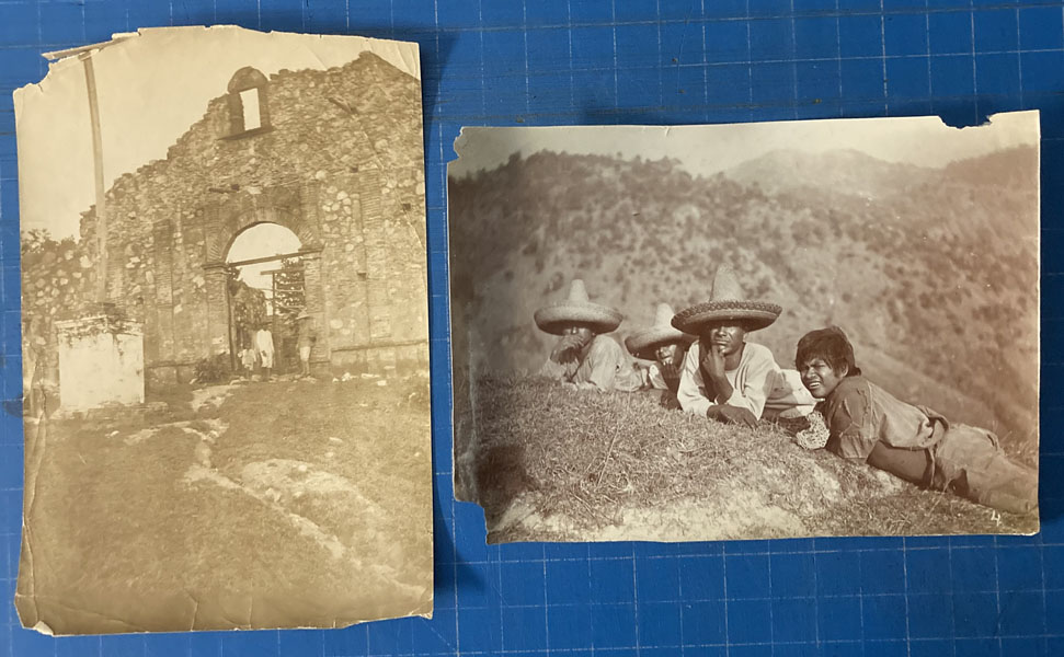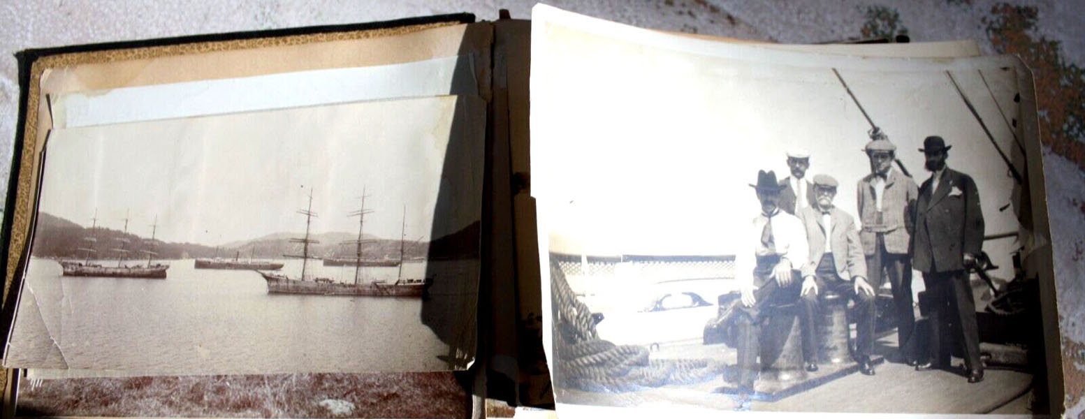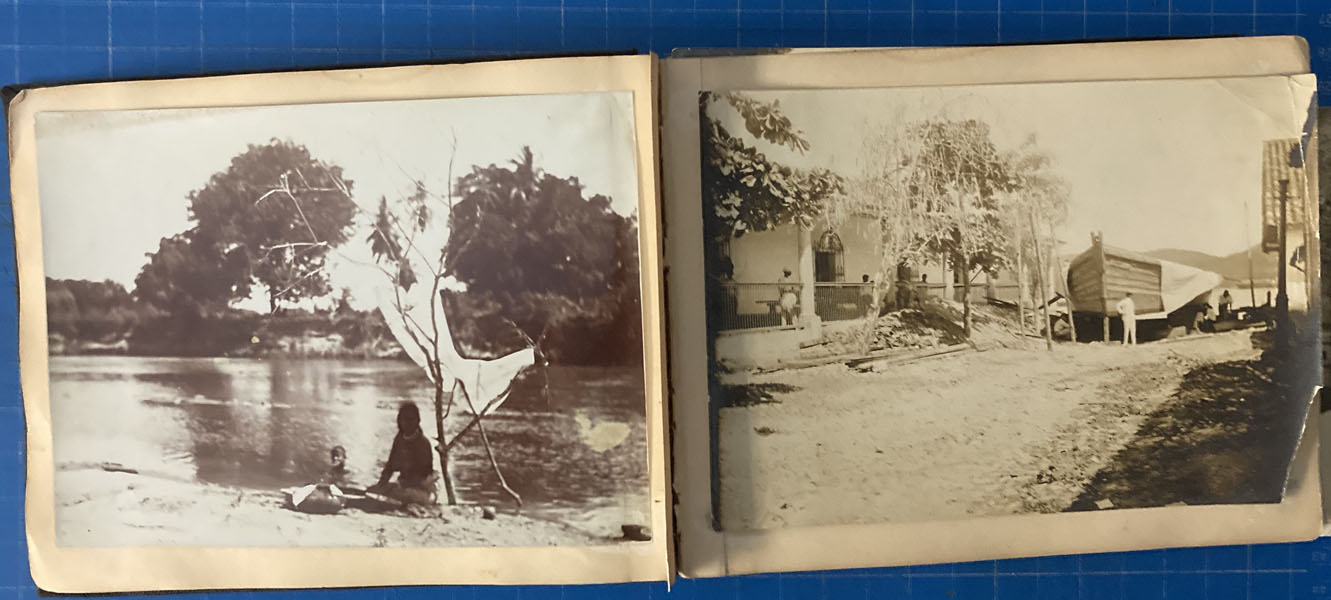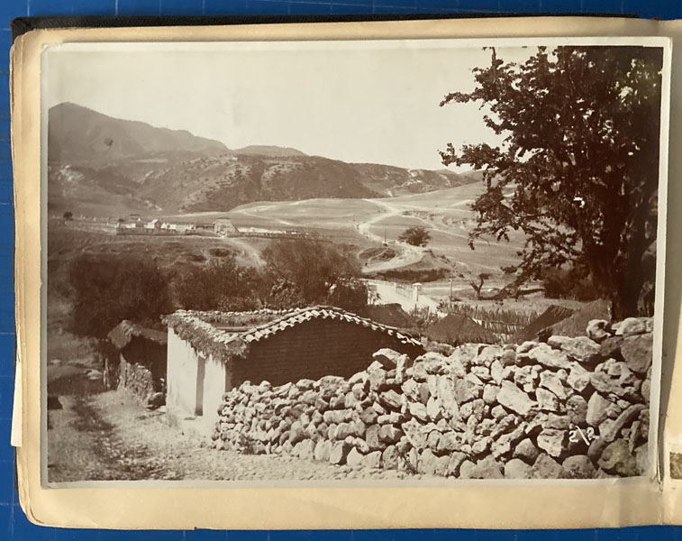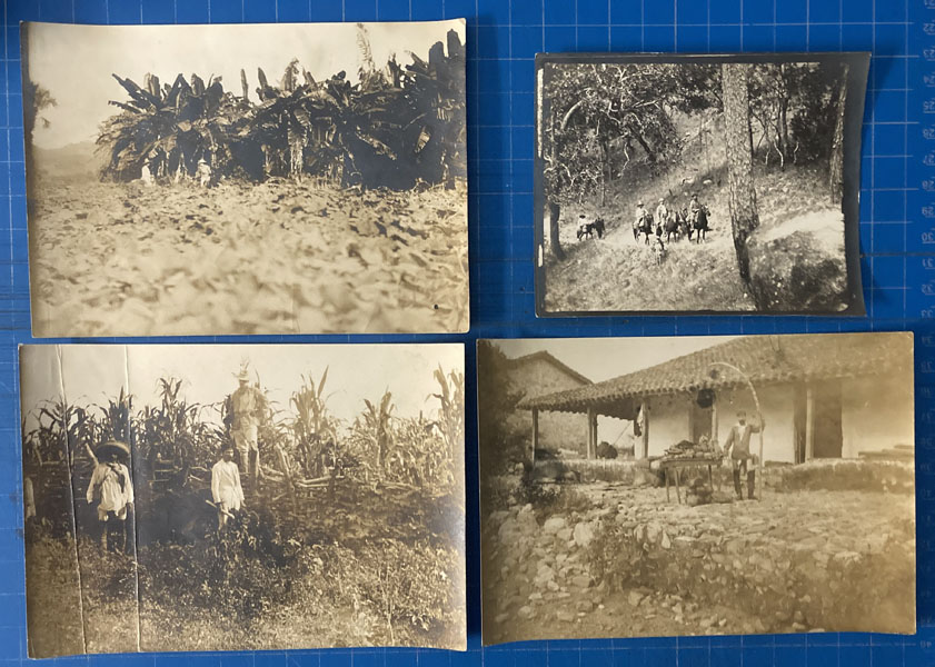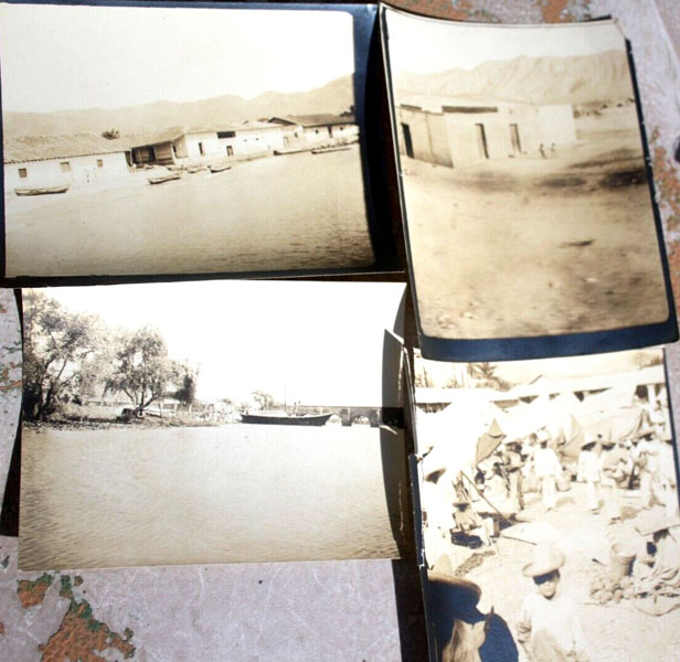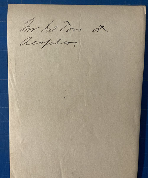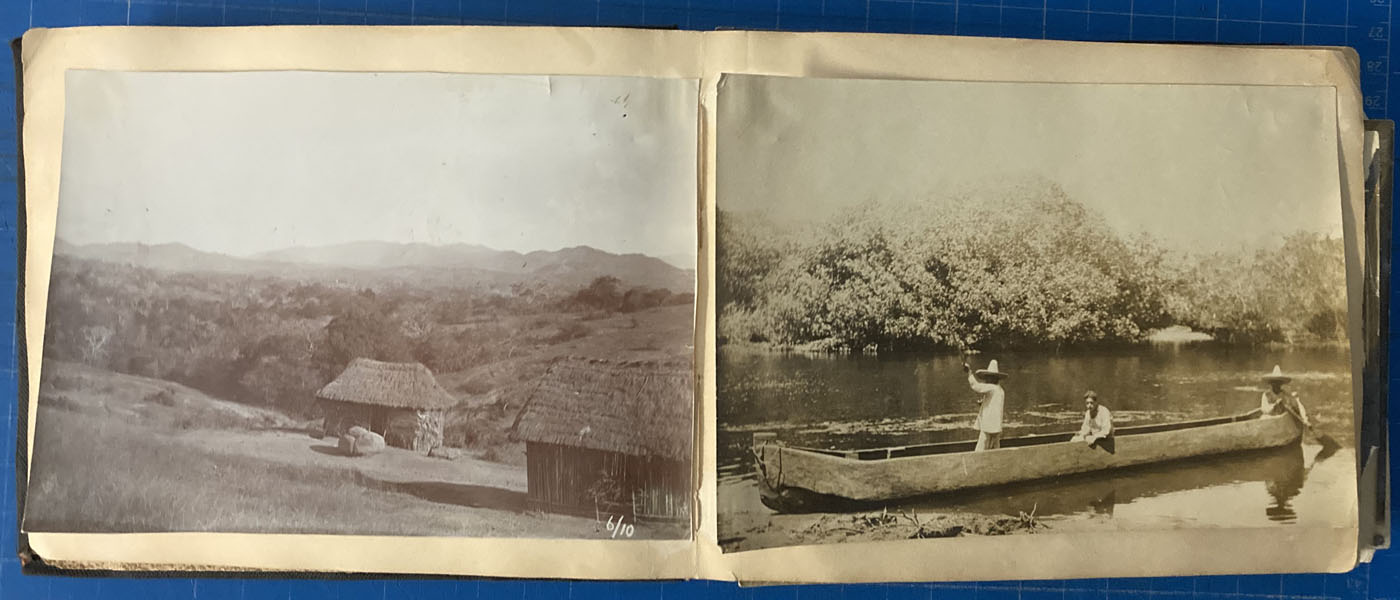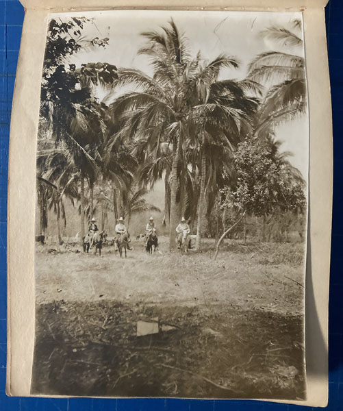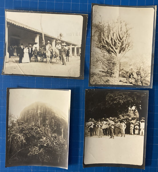 5" x 7" in black cloth with title (photographs) in gilt, housing 97 black and white photographs, sized approximately 4 1/2" x 6 1/2," and 7 black and white postcards, sized 3 1/2" x 5 1/2." All postcards are attached at top edges directly to pages. Several photographs are also attached at edges of prints in order that one can read what is written on the reverse side of the picture.... most times explaining the location, etc. of the photograph. Several photographs loose. All views are in and around Acapulco, Mexico and appear to have been taken in the early 1900s. Pictures include many locals and local scenes, working plantations, hollowed mahogany canoes, para grass fields, shipyard, offices of the Pacific Mail Steamship Company in Acapulco, scenery, ships in Acapulco harbor, many photos dealing with La Providencia, boat built of logs with machete, the Custom House in Acapulco, pictures of the home of “Presidente del Municipalidad,” Americans and Mexicans in front of Hotel Iguala, market scenes, cattle car of the Choctaw, Oklahoma and Gulf railroad, chapel on La Providencia erected for the use of Prest. Alvarez, his family and friends; pictures of locals on horseback, homes, etc. Several photographs indicate that they were taken on Minnirsota(?) Plantation. Mention of a Mr. Del Toro and a Mr. Roach is mentioned on several of the photographs. Rear side of one photo states, “An old cotton manufacturing and — house, Acapulco. Obviously, the proprietors having made their fortunes and returned to Spain.” Another reads, “A native on Minnisota (?) Plantation showing exotic oranges, apples, bananas, tobacco, etc. all grown and gathered without cultivation.” According to the Fruit Trade Journal and Produce Record, February 16, 1907: “Invests $5,000,000 in Fruit Lands. - Mexico City, Feb 12. A party of capitalists from the western coast of the United States, headed by Mr. Arturo del Toro, of Chapala, Mexico, arrived yesterday from Acapulco, where they came by steamer from San Francisco. In the party, besides Mr. Del Toro, are” Moritz Thomsen, of Seattle, Wash., wealthy exporter; J.D. Trenholme, president of the Northwestern Steamship company; E.T. Barnette, Portland, Ore., multi-millionaire; G.L. Campbell, a large grain exporter of Portland; T.F. Ryan, whosesale fruit man of Seattle; Oscar Brown, also in the wholesale fruit business in Vancouver, B.C. and F.C. Stephens, who is extensively interested in Mexican property. This party has just closed a deal for two hundred thousand acres of land twenty miles from Acapulco, and will commence at once to put it in cultivation. A company has been formed with a capital of $5,000,000 gold to raise and ship tropical fruits from this property. Four years ago that country was comparatively unknown except for mining purposes, but since a trip of investigation made at that time by Mr. Del Toro, under the auspices of the government, several million acres of land have passed into the hands of investors, who will pit it into cultivation.” I believe that this album chronicles life in Acapulco of one of the individuals involved in this venture. Photographs generally clear and bright though several have chips, edges missing and creases. Still a great collection of photographs.